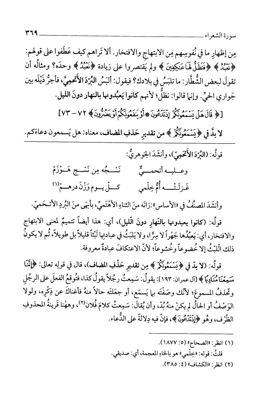 قوله: (لابد في {يَسْمَعُونَكُمْ} من تقدير حذف المضاف)، قال في قوله تعالى: {إِنَّنَا سَمِعْنَا مُنَادِيًا} [آل عمران: 193]: يقول: سمعت رجلاً يقول كذا، فتوقع الفعل على الرجل وتحذف المسموع، لأنك وصفته بما يسمع، أو جعلته حالاً منه فأغناك عن ذكره، ولولا الوصف أو الحال لم يكن منه بد، وأن يقال: سمعت كلام فلان، وههنا قرينة المحذوف الظرف، وهو {إِذْ تَدْعُونَ}، فإن فيه دلالةً على الدعاء.