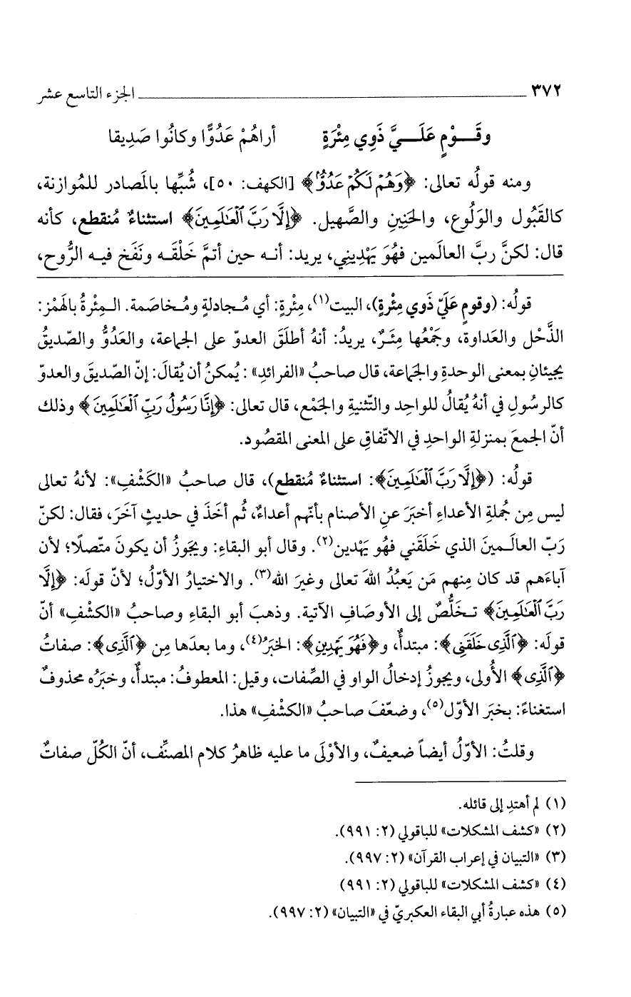ومنه قوله تعالى: (وَهُمْ لَكُمْ عَدُوٌّ) [الكهف: 50]، شبها بالمصادر للموازنة، كالقبول والولوع، والحنين والصهيل. (إِلَّا رَبَّ الْعالَمِينَ) استثناء منقطع، كأنه قال: ولكن رب العالمين فَهُوَ يَهْدِينِي يريد أنه حين أتمّ خلقه ونفخ فيه الروح،