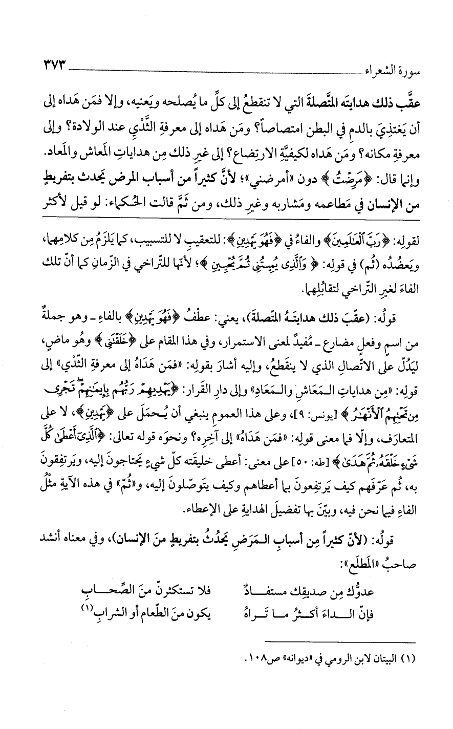 عقب ذلك هدايته المتصلة التي لا تنقطع إلى كلّ ما يصلحه ويعنيه، وإلا فمن هداه إلى أن يغتذى بالدم في البطن امتصاصا؟ ومن هداه إلى معرفة الثدي عند الولادة؟ وإلى معرفة مكانه؟ ومن هداه لكيفية الارتضاع؟ إلى غير ذلك من هدايات المعاش والمعاد، وإنما قال: (مَرِضْتُ) دون "أمرضني"؛ لأنّ كثيرا من أسباب المرض يحدث بتفريط من الإنسان في مطاعمه ومشاربه وغير ذلك. ومن ثم قالت الحكماء: لو قيل لأكثر