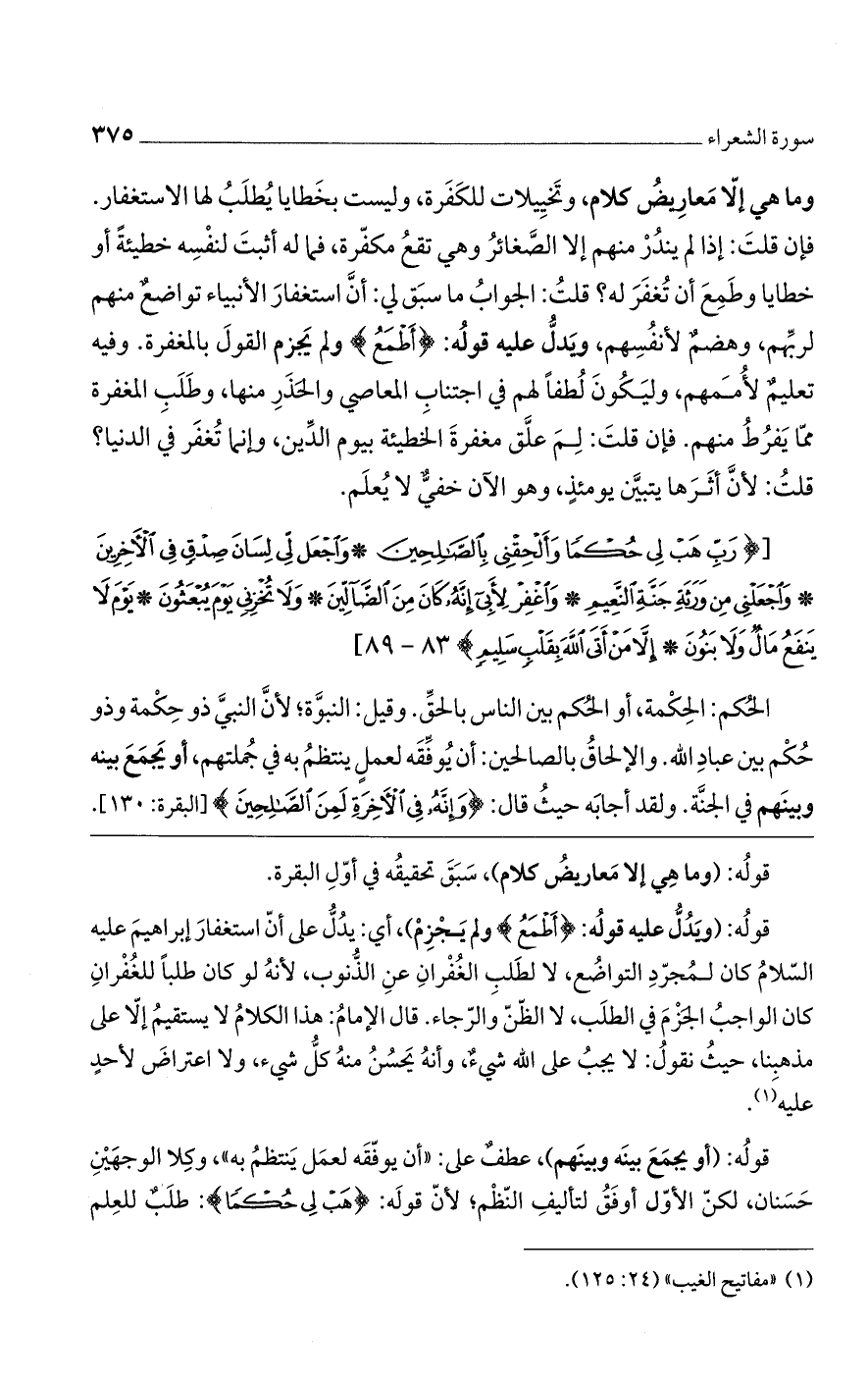 قوله: (ويدل عليه قوله: {أَطْمَعُ} ولم يجزم)، أي: يدل على أن استغفار إبراهيم عليه السلام كان لمجرد التواضع، لا لطلب الغفران عن الذنوب، لأنه لو كان طلباً للغفران كان الواجب الجزم في الطلب، لا الظن والرجاء. قال الإمام: هذا الكلام لا يستقيم إلا على مذهبنا، حيث نقول: لا يجب على الله شيءٌ، وأنه يحسن منه كل شيء، ولا اعتراض لأحدٍ عليه.