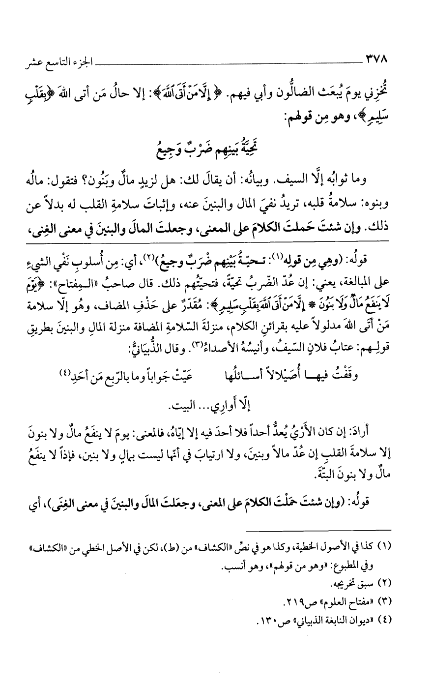 قوله: (وهي من قوله: تحية بينهم ضربٌ وجيع)، أي: من أسلوب نفي الشيء على المبالغة، يعني: إن عد الضرب تحيةً، فتحيتهم ذلك. قال صاحب "المفتاح": {يَوْمَ لَا يَنْفَعُ مَالٌ وَلَا بَنُونَ (88) إِلَّا مَنْ أَتَى اللَّهَ بِقَلْبٍ سَلِيمٍ}: مقدرٌ على حذف المضاف، وهو إلا سلامة من أتى الله مدلولاً عليه بقرائن الكلام، منزلة السلامة المضافة منزلة المال والبنين بطريق قولهم: عتاب فلانٍ السيف، وأنيسه الأصداء. وقال الذبياني: