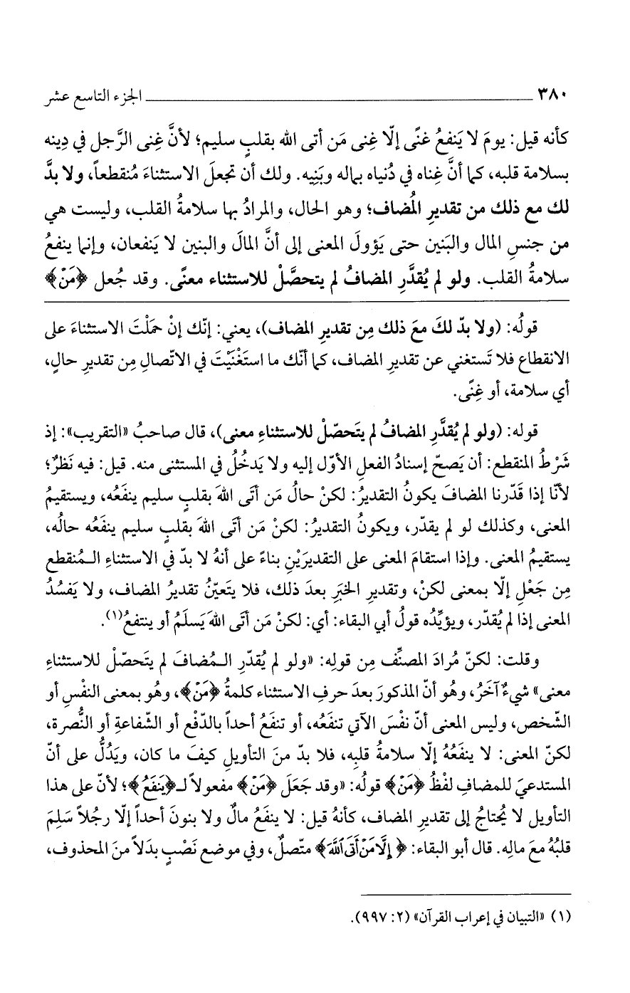 قوله: (ولو لم يقدر المضاف لم يتحصل للاستثناء معنى)، قال صاحب "التقريب": إذ شرط المنقطع: أن يصح إسناد الفعل الأول إليه ولا يدخل في المستثنى منه. قيل: فيه نظرٌ، لأنا إذا قدرنا المضاف يكون التقدير: لكن حال من أتى الله بقلبٍ سليم ينفعه، ويستقيم المعنى، وكذلك لو لم يقدر، ويكون التقدير: لكن من أتى الله بقلبٍ سليم ينفعه حاله، يستقيم المعنى. وإذا استقام المعنى على التقديرين بناءً على أنه لابد في الاستثناء المنقطع من جعل إلا بمعنى لكن، وتقدير الخبر بعد ذلك، فلا يتعين تقدير المضاف، ولا يفسد المعنى إذا لم يقدر، ويؤيده قول أبي البقاء: أي: لكن من أتى الله يسلم أو ينتفع.
