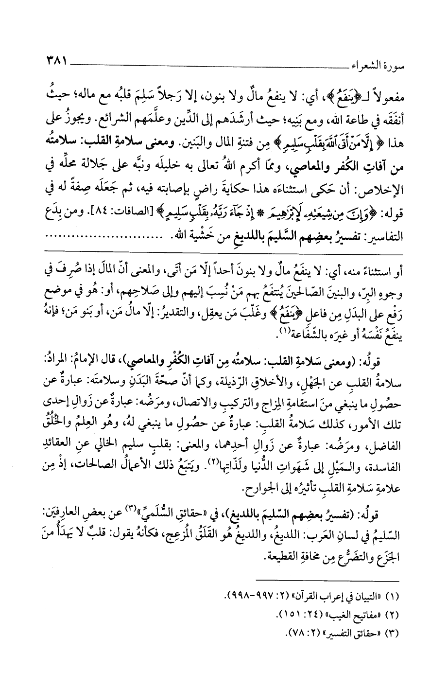 قوله: (ومعنى سلامة القلب: سلامته من آفات الكفر والمعاصي)، قال الإمام: المراد: سلامة القلب عن الجهل، والأخلاق الرذيلة، وكما أن صحة البدن وسلامته: عبارةٌ عن حصول ما ينبغي من استقامة المزاج والتركيب والاتصال، ومرضه: عبارةٌ عن زوال إحدى تلك الأمور، كذلك سلامة القلب: عبارةٌ عن حصول ما ينبغي له، وهو العلم والخلق الفاضل، ومرضه: عبارةٌ عن زوال أحدهما، والمعنى: بقلبٍ سليم الخالي عن العقائد الفاسدة، والميل إلى شهوات الدنيا ولذاتها. ويتبع الأعمال الصالحات، إذ من علامة سلامة القلب تأثيره إلى الجوارح.