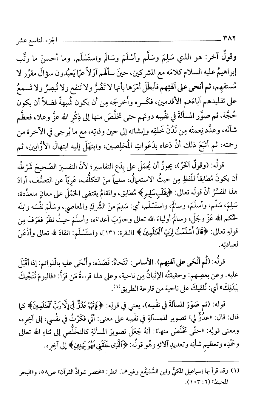 وقول آخر: هو الذي سَلِمَ وسَلَّم وأسْلَمَ وسَالَم واستَسْلَم. وما أحسن ما رتب إبراهيم عليه السلام كلامه مع المشركين، حين سألهم أوّلا عما يعبدون سؤال مقرّر لا مستفهم، ثم أنحى على آلهتهم فأبطل أمرها بأنها لا تضر ولا تنفع ولا تبصر ولا تسمع على تقليدهم آباءهم الأقدمين، فكسره وأخرجه من أن يكون شبهة فضلا أن يكون حجة، ثم صوّر المسألة في نفسه دونهم حتى تخلص منها إلى ذكر الله عز وعلا، فعظم شأنه وعدّد نعمته، من لدن خلقه وإنشائه إلى حين وفاته، مع ما يرجى في الآخرة من رحمته، ثم أتبع ذلك أن دعاه بدعوات المخلصين، وابتهل إليه ابتهال الأوّابين، ثم