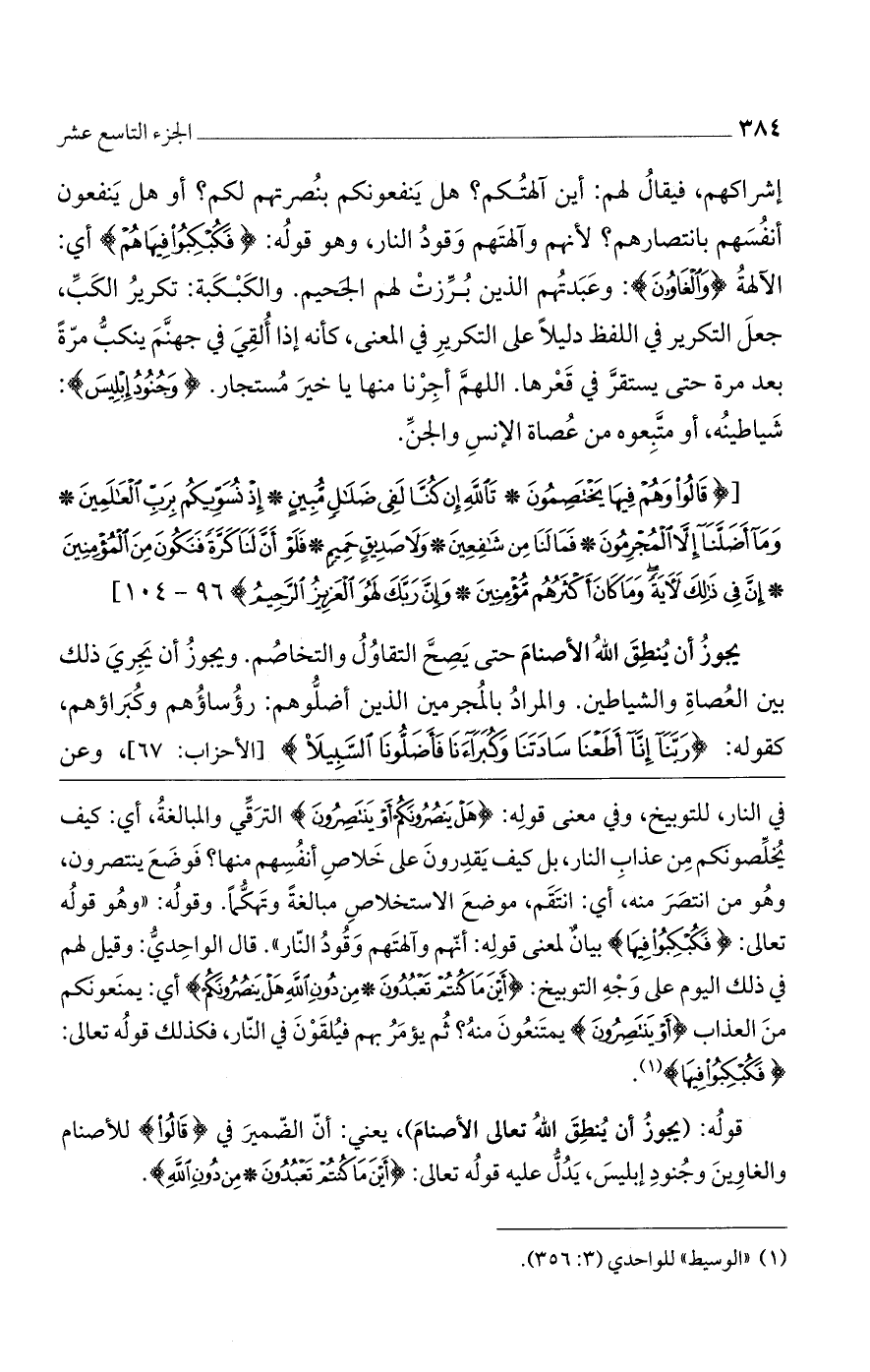 في النار، للتوبيخ، وفي معنى قوله: {هَلْ يَنْصُرُونَكُمْ أَوْ يَنْتَصِرُونَ} الترقي والمبالغة، أي: كيف يخلصونكم من عذاب النار، بل كيف يقدرون على خلاص أنفسهم منها؟ فوضع ينتصرون، وهو من انتصر منه، أي: انتقم، موضع الاستخلاص مبالغةً وتهكماً. وقوله: "وهو قوله تعالى: {فَكُبْكِبُوا فِيهَا} بيانٌ لمعنى قوله: أنهم وآلهتهم وقود النار". قال الواحدي: وقيل لهم في ذلك اليوم على وجه التوبيخ: {أَيْنَ مَا كُنْتُمْ تَعْبُدُونَ (92) مِنْ دُونِ اللَّهِ هَلْ يَنْصُرُونَكُمْ} أي: يمنعونكم من العذاب {أَوْ يَنْتَصِرُونَ} يمتنعون منه؟ ثم يؤمر بهم فيلقون في النار، فكذلك قوله تعالى: {فَكُبْكِبُوا فِيهَا}.