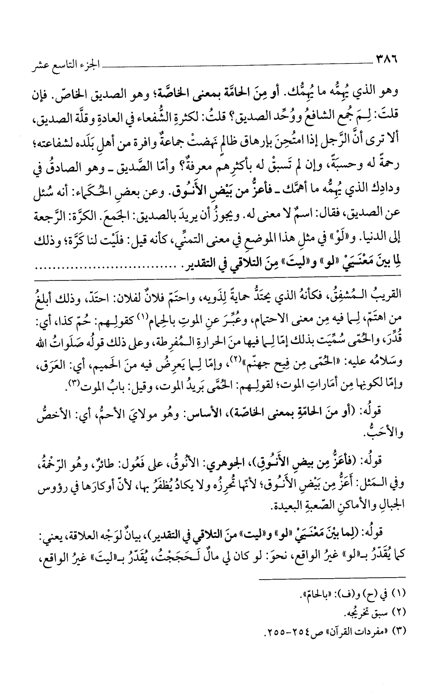 وهو الذي يهمه ما يهمك. أو من الحامة بمعنى الخاصة، وهو الصديق الخاص. فإن قلت: لم جمع الشافع ووحد الصديق؟ قلت: لكثرة الشفعاء في العادة وقلة الصديق. ألا ترى أن الرجل إذا امتحن بإرهاق ظالم نهضت جماعة وافرة من أهل بلده لشفاعته، رحمة له وحسبة، وإن لم يسبق له بأكثرهم معرفة. وأما الصديق - وهو الصادق في ودادك الذي يهمه ما أهمك - فأعز من بيض الأنوق. وعن بعض الحكماء أنه سئل عن الصديق فقال: اسم لا معنى له. ويجوز أن يريد بالصديق: الجمع. الكرّة: الرجعة إلى الدنيا. ولو في مثل هذا الموضع في معنى التمني، كأنه قيل: فليت لنا كرة. وذلك لما بين معنى «لو» و «ليت» من التلاقي في التقدير