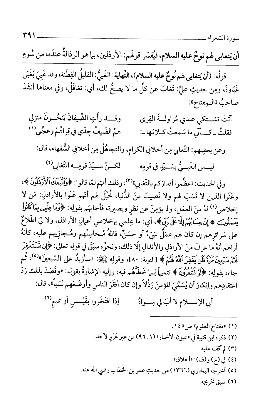 وفي الحديث: "عظموا أقداركم بالتغابي"، وذلك أنهم لما قالوا: {وَاتَّبَعَكَ الْأَرْذَلُونَ}، وعنوا الذين لا نسب لهم ولا نصيب من الدنيا، خيل لهم أنهم عنوا بالأراذل: من لا إخلاص له من العمل، ولم يؤمن عن نظرٍ وبصيرة، فأجابهم بقوله: {وَمَا عِلْمِي بِمَا كَانُوا يَعْمَلُونَ (112) إِنْ حِسَابُهُمْ إِلَّا عَلَى رَبِّي}، أي: ما علمي بإخلاص أعمال الأراذل، ولا لي اطلاعٌ على سرائرهم إن كان لهم عملٌ سيءٌ أو حسنٌ، فالله محاسبهم ومجازيهم عليه، كأنه أراهم أنه ما عرف من الأراذل والأنذال إلا ذلك، ونحوه سبق في قوله تعالى: {إِنْ تَسْتَغْفِرْ لَهُمْ سَبْعِينَ مَرَّةً فَلَنْ يَغْفِرَ اللَّهُ لَهُمْ} [التوبة: 80]، وقوله - صلى الله عليه وسلم -: "سأزيد على السبعين"، ثم جاءه بقوله: {لَوْ تَشْعُرُونَ} تتميماً لما خطأهم فيه، وإليه الإشارة بقوله: "وقصد بذلك رد اعتقادهم وإنكار أن يسمى المؤمن رذلاً وإن كان أفقر الناس وأوضعهم نسباً"، قال: