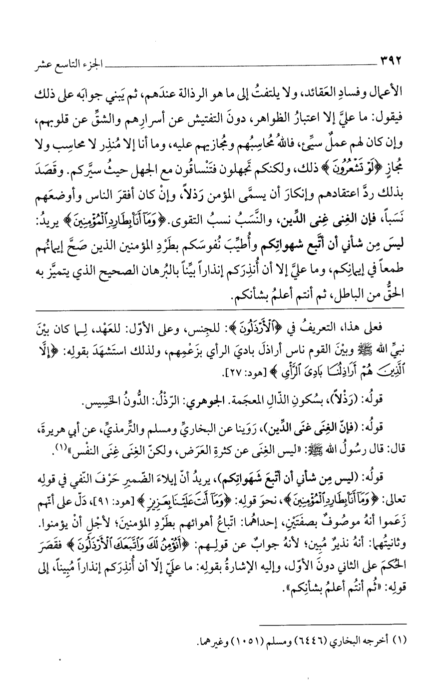 قوله: (فإن الغنى غنى الدين)، روينا عن البخاري ومسلم والترمذي، عن أبي هريرة، قال: قال رسول الله - صلى الله عليه وسلم -: "ليس الغنى عن كثرة العرض، ولكن الغنى غنى النفس".