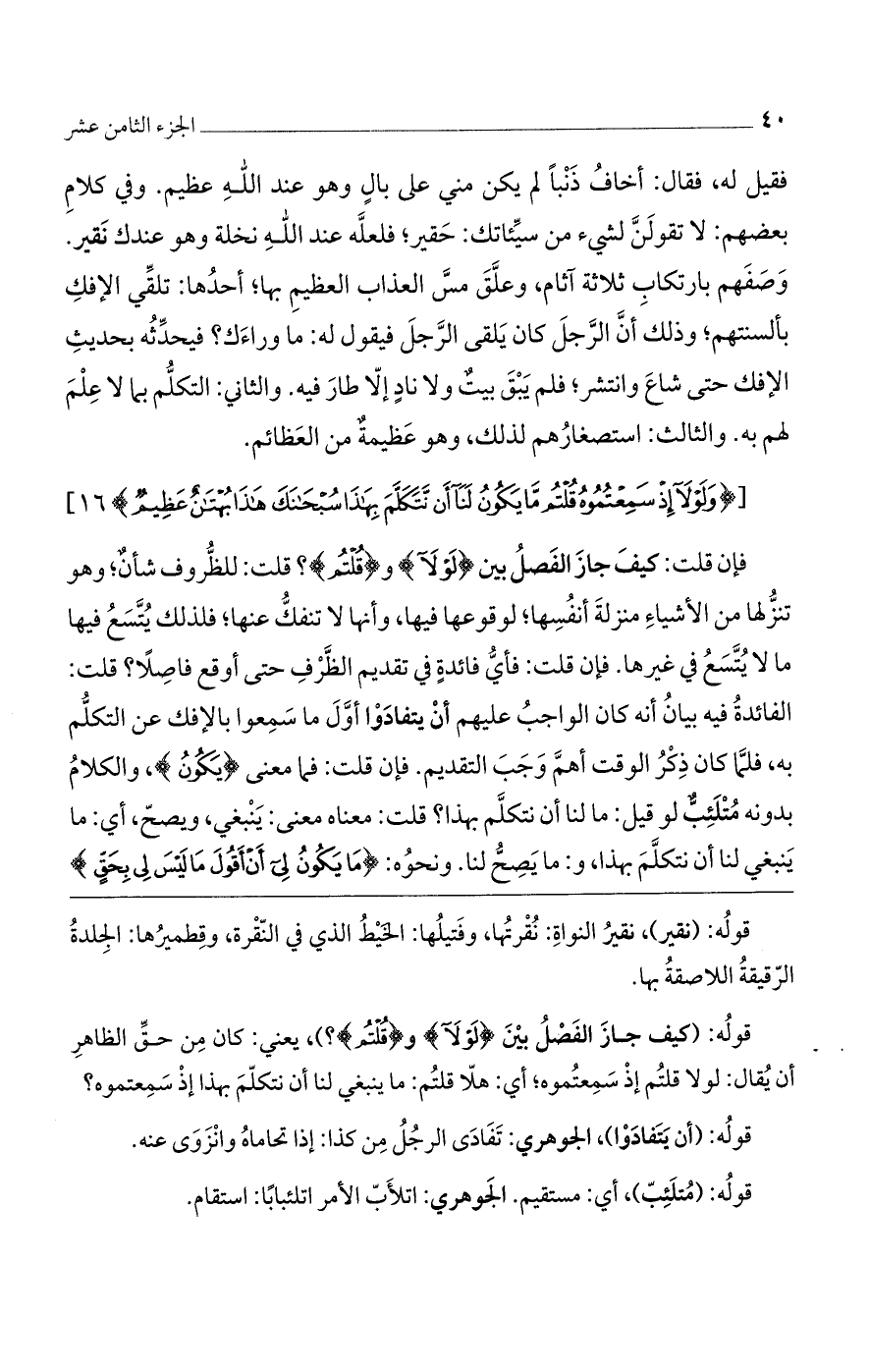 فإن قلت: كيف جاز الفصل بين {لَوْلَا} و {قُلْتُمْ}؟ قلت: للظروف شأنٌ، وهو تنزلها من الأشياء منزلة أنفسها، لوقوعها فيها، وأنها لا تنفك عنها، فلذلك يتسع فيها ما لا يتسع في غيرها. فإن قلت: فأي في تقديم الظرف حتى أوقع فاصلًا؟ قلت: الفائدة فيه بيان أنه كان الواجب عليهم أن يتفادوا أول ما سمعوا بالإفك عن التكلم به، فلما كان ذكر الوقت أهم وجب التقديم. فإن قلت: فما معنى {يَكُونُ}، والكلام بدونه متلئبٌ لو قيل: ما لنا أن نتكلم بهذا؟ قلت: ما معناه معنى: ينبغي، ويصح، أي: ما ينبغي لنا أن نتكلم بهذا، و: ما يصح لنا. ونحوه: {مَا يَكُونُ لِي أَنْ أَقُولَ مَا لَيْسَ لِي بِحَقٍّ}