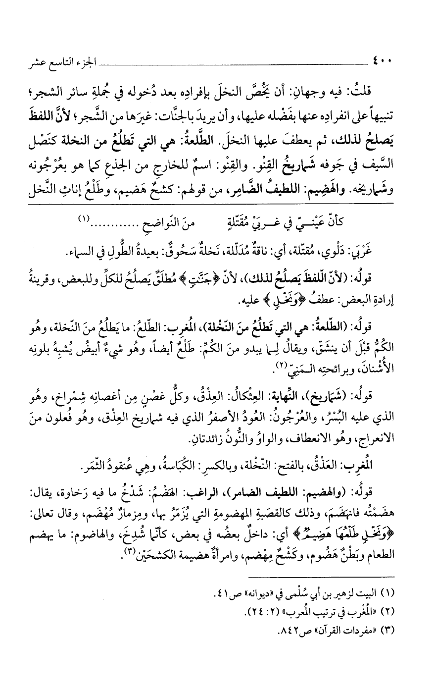 قلت: فيه وجهان: أن يخص النخل بإفراده بعد دخوله في جملة سائر الشجر، تنبيها على انفراده عنها بفضله عليها، وأن يريد بالجنات: غيرها من الشجر، لأنّ اللفظ يصلح لذلك، ثم يعطف عليها النخل. الطلعة: هي التي تطلع من النخلة، كنصل السيف في جوفه شماريخ القنو. والقنو: اسم للخارج من الجذع كما هو بعرجونه وشماريخه. والهضيم: اللطيف الضامر، من قولهم: كشح هضيم، وطلع إناث النخل