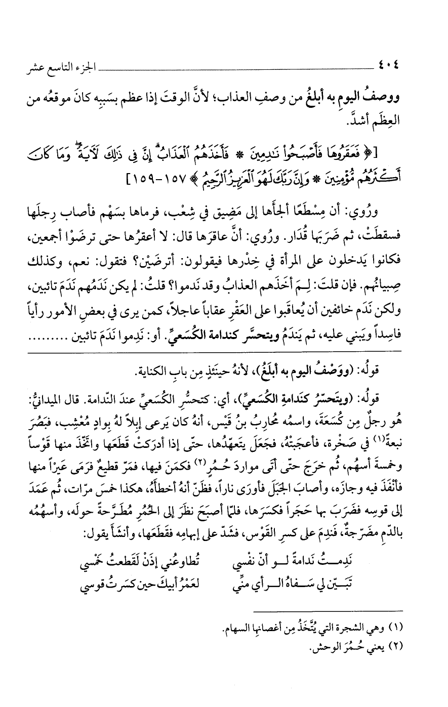 قوله: (ويتحسر كندامة الكسعي)، أي: كتحسر الكسعي عند الندامة. قال الميداني: هو رجلٌ من كسعة، واسمه محارب بن قيس، أنه كان يرعى إبلاً له بوادٍ معشب، فبصر نبعةً في صخرة، فأعجبته، فجعل يتعهدها، حتى إذا أدركت قطعها واتخذ منها قوساً وخمسة أسهم، ثم خرج حتى أتى موارد خمرٍ فكمن فيها، فمر قطيعٌ فرمى عيراً منها فأنفذ فيه وجازه، وأصاب الجبل فأورى ناراً، فظن أنه أخطأه، هكذا خمس مرات، ثم عمد إلى قوسه فضرب بها حجراً فكسرها، فلما أصبح نظر إلى الحمر مطرحةً حوله، وأسهمه بالدم مضرجةٌ، فندم على كسر القوس، فشد على إبهامه فقطعها، وأنشأ يقول:
