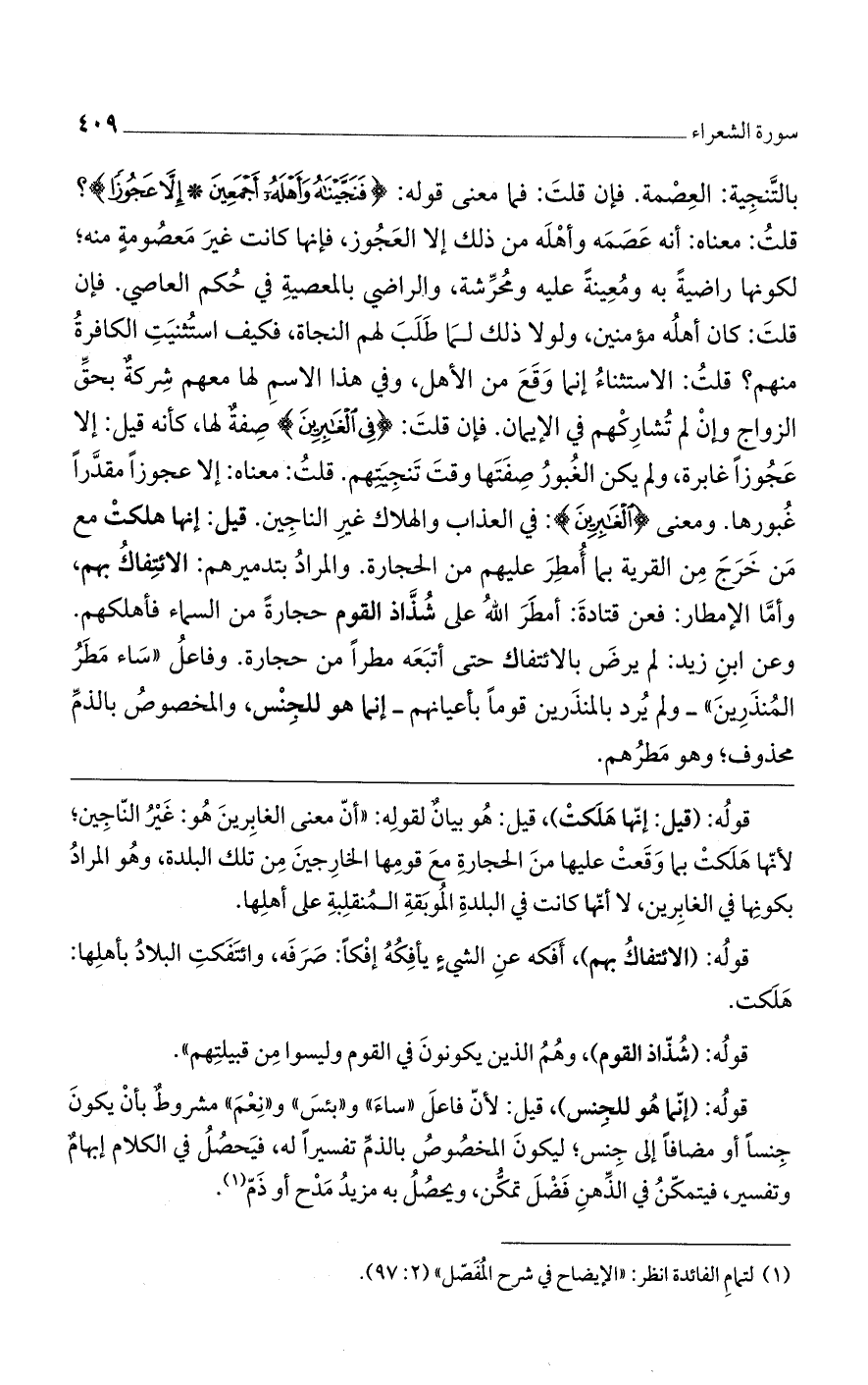 بالتنجية: العصمة. فإن قلت: فما معنى قوله: (فَنَجَّيْناهُ وَأَهْلَهُ أَجْمَعِينَ * إِلَّا عَجُوزاً)؟ قلت: معناه أنه عصمه وأهله من ذلك إلا العجوز، فإنها كانت غير معصومة منه، لكونها راضية به ومعينة عليه ومحرشة، والراضي بالمعصية في حكم العاصي. فإن قلت: كان أهله مؤمنين ولولا ذلك لما طلب لهم النجاة، فكيف استثنيت الكافرة منهم: قلت الاستثناء إنما وقع من الأهل وفي هذا الاسم لها معهم شركة بحق الزواج وإن لم تشاركهم في الإيمان. فإن قلت: (فِي الْغابِرِينَ) صفة لها، كأنه قيل: إلا عجوزا غابرة، ولم يكن الغبور صفتها وقت تنجيتهم قلت: معناه إلا عجوزا مقدّرا غبورها. ومعنى (الْغابِرِينَ): في العذاب والهلاك: غير الناجين. قيل: إنها هلكت مع من خرج من القرية بما أمطر عليهم من الحجارة. والمراد بتدميرهم: الائتفاك بهم، وأمّا الإمطار: فعن قتادة: أمطر الله على شذاذ القوم حجارة من السماء فأهلكهم. وعن ابن زيد: لم يرض بالائتفاك حتى أتبعه مطرا من حجارة. وفاعل "ساءَ مَطَرُ الْمُنْذَرِينَ"- ولم يرد بالمنذرين قوما بأعيانهم، إنما هو للجنس، والمخصوص بالذّم محذوف، وهو مطرهم.