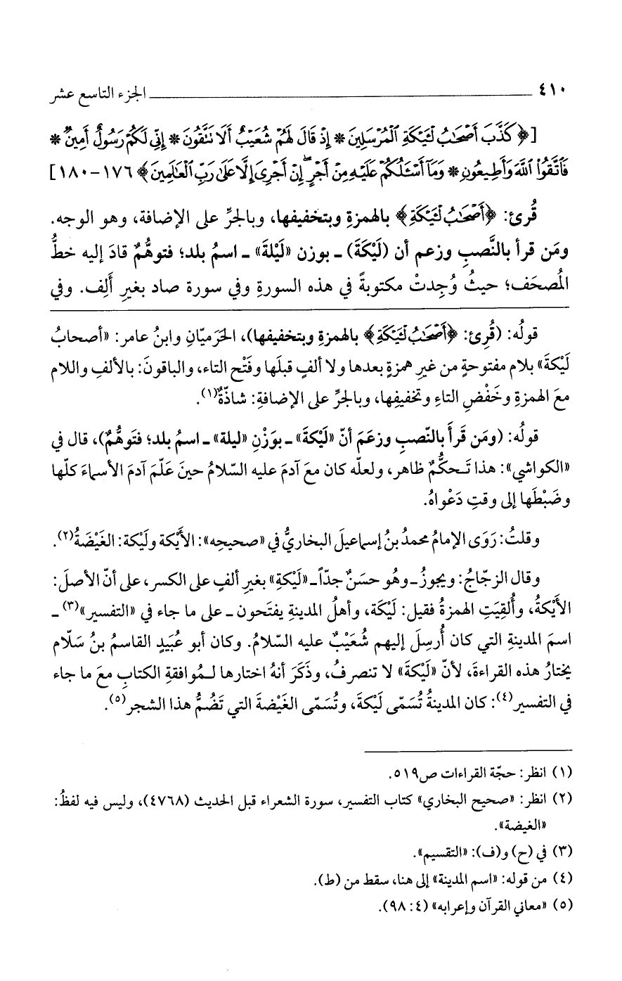 قوله: (ومن قرأ بالنصب وزعم أن "ليكة"- بوزن "ليلة"- اسم بلد، فتوهمٌ)، قال في "الكواشي": هذا تحكمٌ ظاهر، ولعله كان مع آدم عليه السلام حين علم آدم الأسماء كلها وضبطها إلى وقت دعواه.