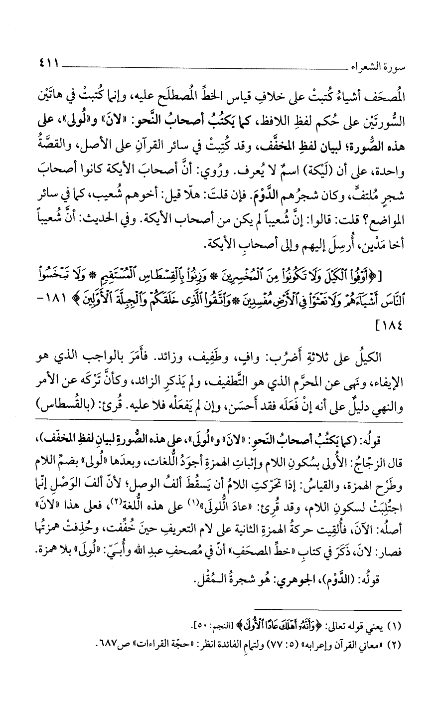قوله: (كما يكتب أصحاب النحو: "لان" و"لولى"، على هذه الصورة لبيان لفظ المخفف)، قال الزجاج: الأولى بسكون اللام وإثبات الهمزة أجود اللغات، وبعدها "لولى" بضم اللام وطرح الهمزة، والقياس: إذا تحركت اللام أن يسقط ألف الوصل، لأن ألف الوصل إنا اجتلبت لسكون اللام، وقد قرئ: "عاد اللولى" على هذه اللغة، فعلى هذا "لان" أصله: الآن، فألقيت حركة الهمزة الثانية على لام التعريف حين خففت، وحذفت همزتها فصار: لان، ذكر في كتاب "خط المصحف" أن في مصحف عبد الله وأبي: "لولى" بلا همزة.
