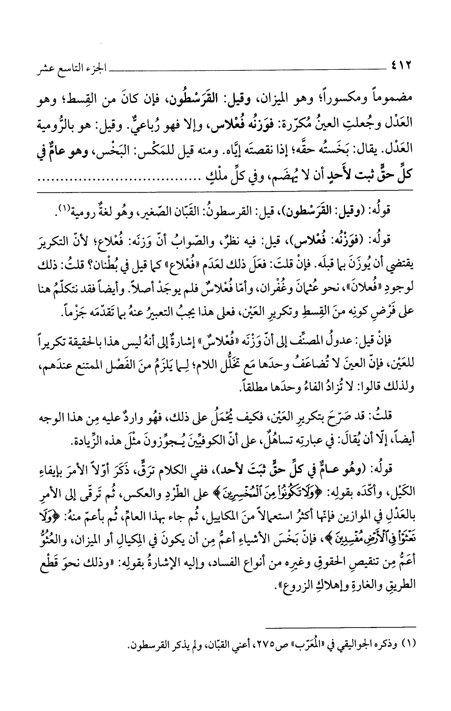 قوله: (وقيل: القرسطون)، قيل: القرسطون: القبان الصغير، وهو لغةٌ رومية.
