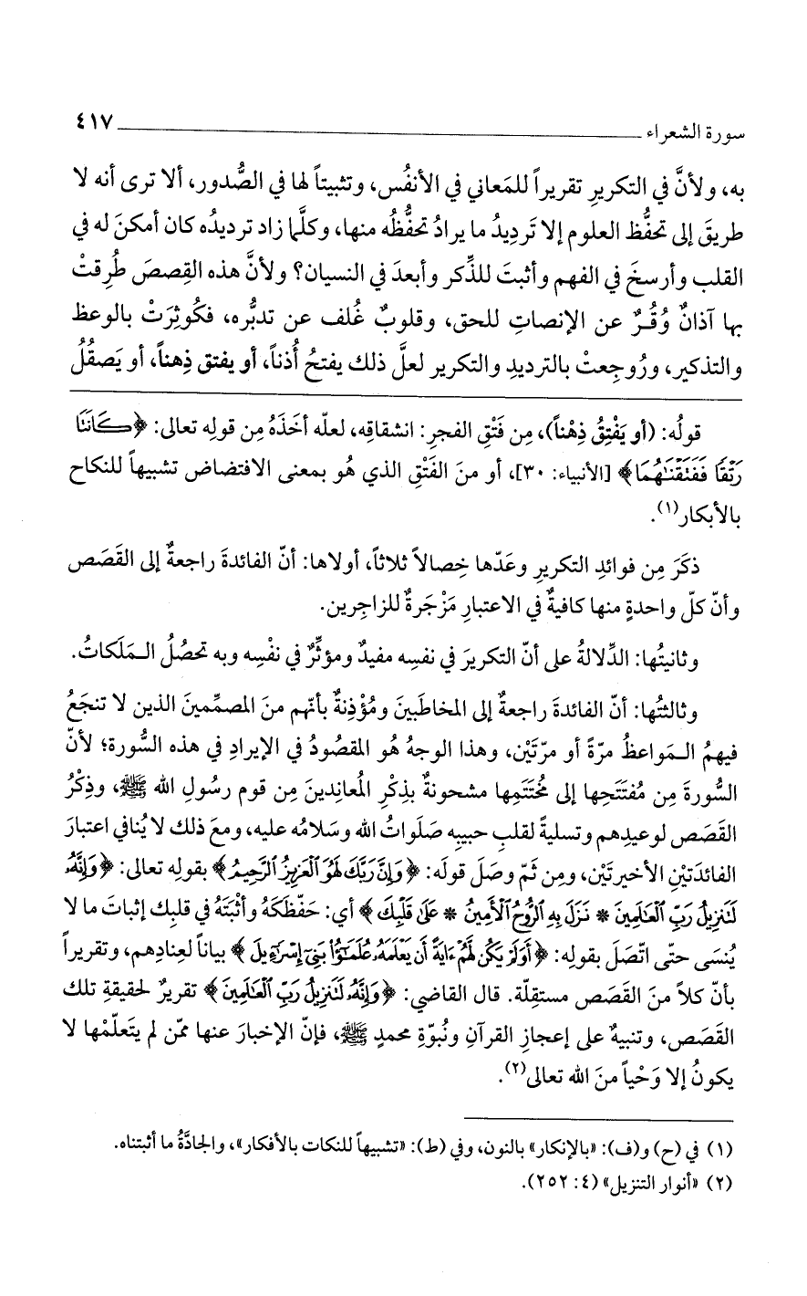 به، ولأنّ في التكرير تقريرا للمعاني في الأنفس، وتثبيتا لها في الصدور. ألا ترى أنه لا طريق إلى تحفظ العلوم إلا ترديد ما يراد تحفظه منها، وكلما زاد ترديده كان أمكن له في القلب وأرسخ في الفهم وأثبت للذكر وأبعد في النسيان؟ ولأنّ هذه القصص طرقت بها آذان وقر عن الإنصات للحق، وقلوب غلف عن تدبره، فكوثرت بالوعظ والتذكير، وروجعت بالترديد والتكرير لعل ذلك يفتح أذنا، أو يفتق ذهنا، أو يصقل
