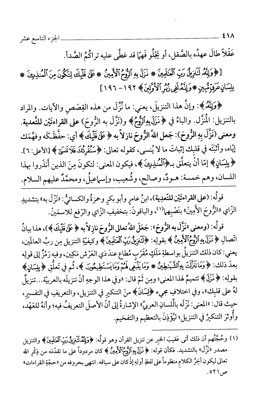 قوله: (على القراءتين للتعدية)، ابن عامرٍ وأبو بكرٍ وحمزة والكسائي: "نزل به" بتشديد الزاي "الروح الأمين" بنصبهما، والباقون: بتخفيف الزاي والرفع للاسمين.