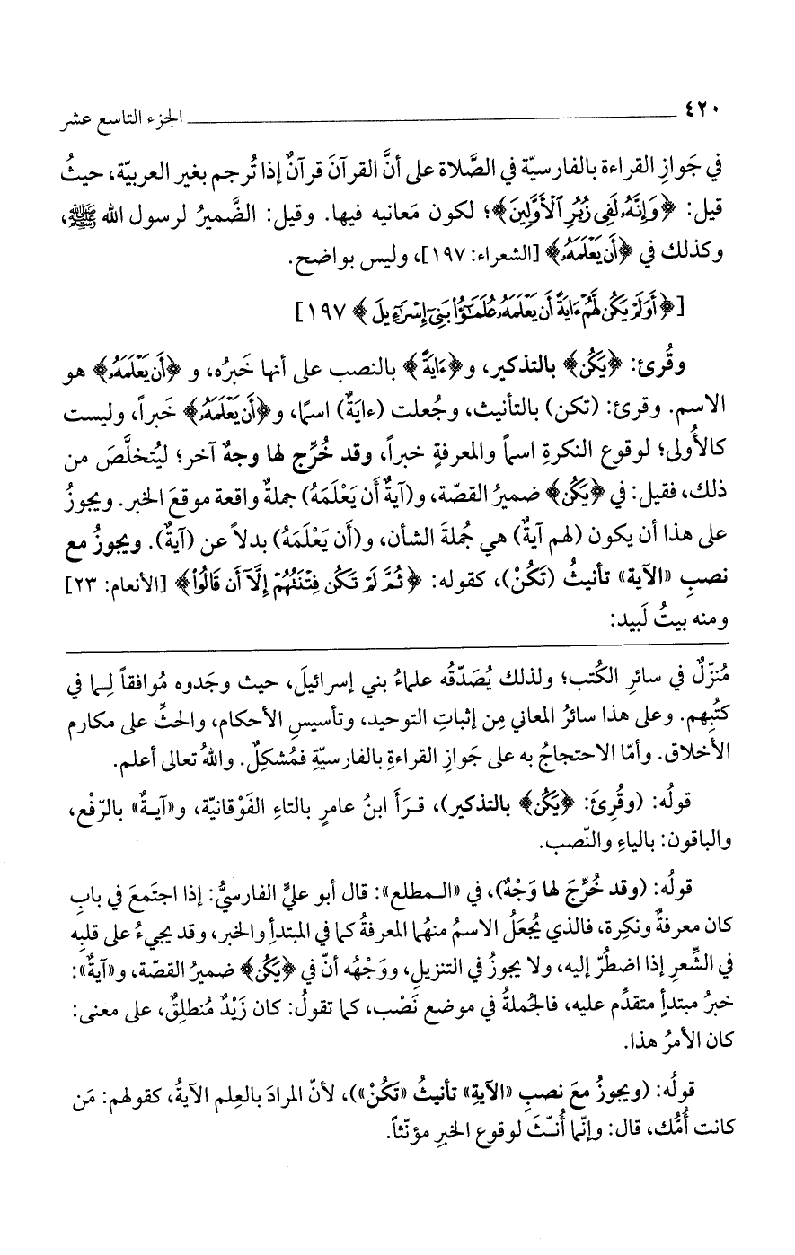 في جواز القراءة بالفارسية في الصلاة على أن القرآن قرآن إذا ترجم بغير العربية، حيث قيل: (وَإِنَّهُ لَفِي زُبُرِ الْأَوَّلِينَ)؛ لكون معانيه فيها. وقيل: الضمير لرسول الله صلى الله عليه وسلم وكذلك في (أَنْ يَعْلَمَهُ) [الشعراء: 197]، وليس بواضح.