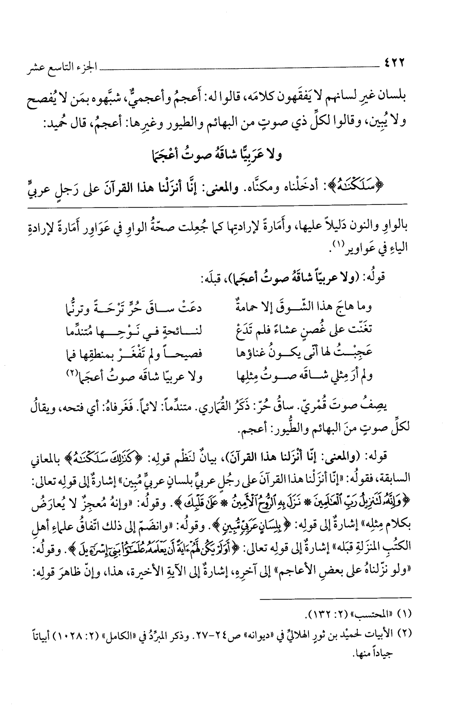 قوله: (والمعنى: إنا أنزلنا هذا القرن)، بيانٌ لنظم قوله: {كَذَلِكَ سَلَكْنَاهُ} بالمعاني السابقة، فقوله: "إنا أنزلنا هذا القرآن على رجلٍ عربي بلسان عربيٍّ مبين" إشارةٌ إلى قوله تعالى: {وَإِنَّهُ لَتَنْزِيلُ رَبِّ الْعَالَمِينَ (192) نَزَلَ بِهِ الرُّوحُ الْأَمِينُ (193) عَلَى قَلْبِكَ}. وقوله: "وإنه معجزٌ لا يعارض بكلام مثله" إشارةٌ إلى قوله: {بِلِسَانٍ عَرَبِيٍّ مُبِينٍ}. وقوله: "وانضم إلى ذلك اتفاق علماء أهل الكتب المنزلة قبله" إشارةٌ إلى قوله تعالى: {أَوَلَمْ يَكُنْ لَهُمْ آَيَةً أَنْ يَعْلَمَهُ عُلَمَاءُ بَنِي إِسْرَائِيلَ}. وقوله: "ولو نزلناه على بعض الأعاجم" إلى آخره، إشارةٌ إلى الآية الأخيرة، هذا، وإن ظاهر قوله:
