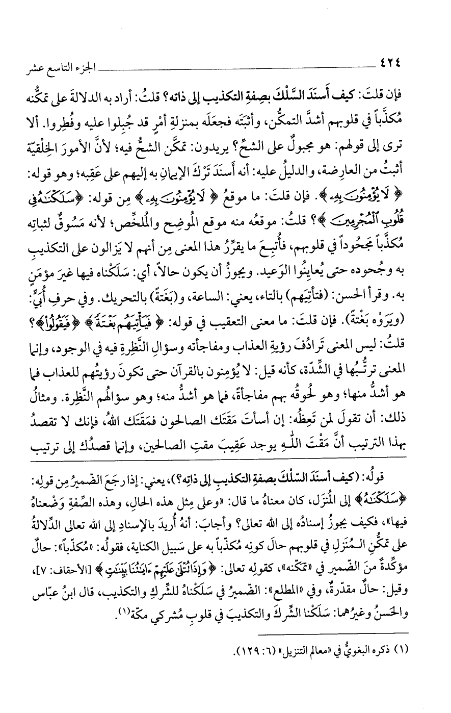 فإن قلت: كيف أسند السلك بصفة التكذيب إلى ذاته؟ قلت: أراد به الدلالة على تمكنه مكذبا في قلوبهم أشدّ التمكن، وأثبته فجعله بمنزلة أمر قد جبلوا عليه وفطروا. ألا ترى إلى قولهم: هو مجبول على الشح؟ يريدون: تمكن الشحّ فيه، لأنّ الأمور الخلقية أثبت من العارضة، والدليل عليه: أنه أسند ترك الإيمان به إليهم على عقبه؛ وهو قوله: (لا يُؤْمِنُونَ بِهِ). فإن قلت: ما موقع (لا يُؤْمِنُونَ بِهِ) من قوله: (سَلَكْناهُ فِي قُلُوبِ الْمُجْرِمِينَ)؟ قلت: موقعه منه موقع الموضح والملخص، لأنه مسوق لثباته مكذبا مجحودا في قلوبهم، فأتبع ما يقرّر هذا المعنى من أنهم لا يزالون على التكذيب به وجحوده حتى يعاينوا الوعيد. ويجوز أن يكون حالا، أى: سلكناه فيها غير مؤمن به. وقرأ الحسن: (فتأتِيهم) بالتاء يعني: الساعة. و (بَغَتةً) بالتحريك. وفي حرف أبىّ: (ويروه بغتة). فإن قلت: ما معنى التعقيب في قوله: (فَيَاتِيَهُمْ بَغْتَةً) (فَيَقُولُوا)؟ قلت: ليس المعنى ترادف رؤية العذاب ومفاجأته وسؤال النظرة فيه في الوجود، وإنما المعنى ترتبها في الشدّة، كأنه قيل: لا يؤمنون بالقرآن حتى تكون رؤيتهم للعذاب فما هو أشدّ منها؛ وهو لحوقه بهم مفاجأة، فما هو أشدّ منه وهو سؤالهم النظرة. ومثال ذلك أن تقول لمن تعظه: إن أسات مقتك الصالحون فمقتك الله، فإنك لا تقصد بهذا الترتيب أنّ مقت الله يوجد عقيب مقت الصالحين، وإنما قصدك إلى ترتيب