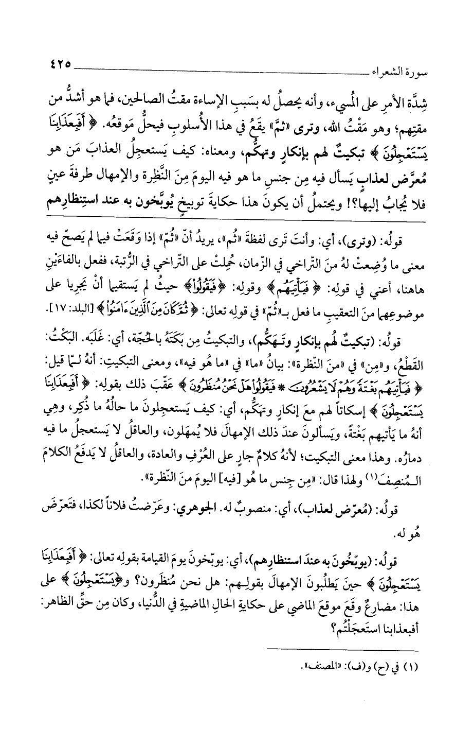 قوله: (تبكيتٌ لهم بإنكارٍ وتهكم)، والتبكيت من بكتة بالحجة، أي: غلبه. البكت: القطع، و"من" في "من النظرة": بيان "ما" في "ما هو فيه"، ومعنى التبكيت: أنه لما قيل: {فَيَاتِيَهُمْ بَغْتَةً وَهُمْ لَا يَشْعُرُونَ (202) فَيَقُولُوا هَلْ نَحْنُ مُنْظَرُونَ} عقب ذلك بقوله: {أَفَبِعَذَابِنَا يَسْتَعْجِلُونَ} إسكاتاً لهم مع إنكارٍ وتهكم، أي: كيف يستعجلون ما حاله ما ذكر، وهي أنه ما يأتيهم بغتةً، ويسألون عند ذلك الإمهال فلا يمهلون، والعاقل لا يستعجل ما فيه دماره. وهذا معنى التبكيت، لأنه كلامٌ جارٍ على العرف والعادة، والعاقل لا يدفع الكلام المنصف ولهذا قال: "من جنس ما هو [فيه] اليوم النظرة".