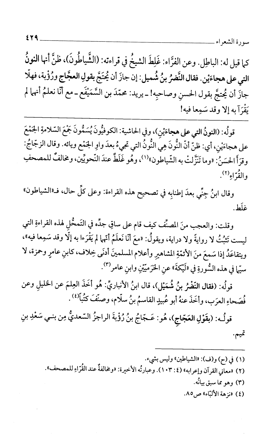 كما قيل له الباطل. وعن الفرّاء: غلط الشيخ في قراءته: (الشياطون)، ظنّ أنها النون التي على هجاءين، فقال النضر بن شميل: إن جاز أن يحتج بقول العجاج ورؤبة، فهلا جاز أن يحتجّ بقول الحسن وصاحبه! - يريد: محمد ابن السميقع - مع أنا نعلم أنهما لم يقرءا به إلا وقد سمعا فيه!