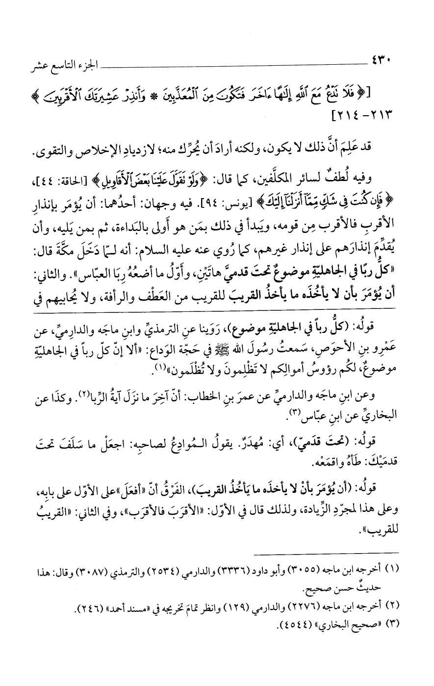 قوله: (كل رباً في الجاهلية موضوع)، روينا عن الترمذي وابن مجاه والدرامي، عن عمرو بن الأحوص، سمعت رسول الله - صلى الله عليه وسلم - في حجة الوداع: "ألا أن كل رباً في الجاهلية موضوعٌ، لكم رؤوس أموالكم لا تظلمون ولا تظلمون".