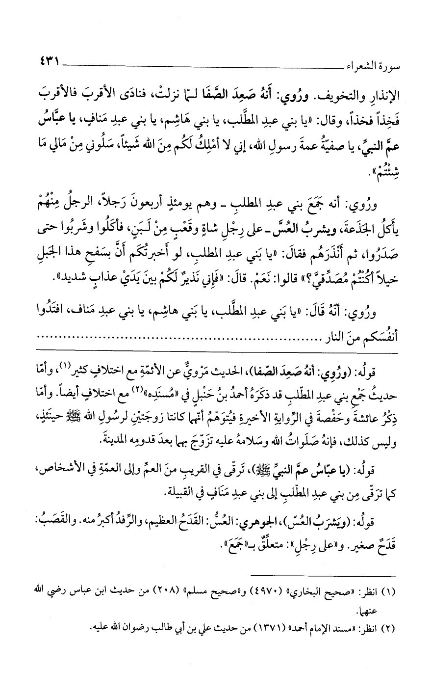 قوله: (وروي: أنه صعد الصفا)، الحديث مرويٌ عن الأئمة مع اختلافٍ كثير، وأما حديث جمع بني عبد المطلب قد ذكره أحمد بن حنبلٍ في "مسنده" مع اختلافٍ أيضاً. وأما ذكر عائشة وحفصة في الرواية الأخيرة فيتوهم أنهما كانتا زوجين لرسول الله - صلى الله عليه وسلم - حينئذٍ، وليس كذلك، فإنه صلوات الله وسلامه عليه تزوج بهما بعد قدومه المدينة.