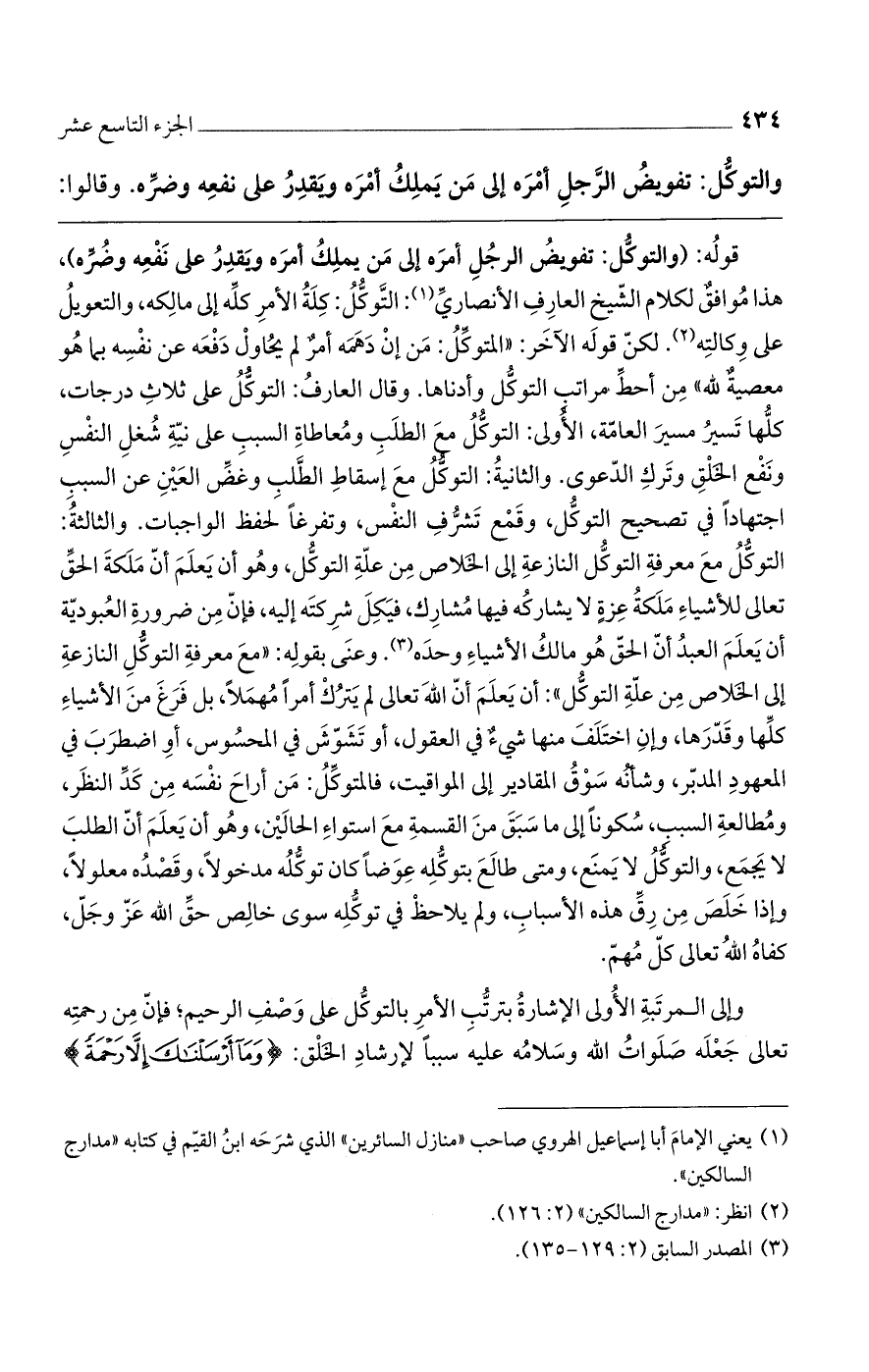 قوله: (والتوكل: تفويض الرجل أمره إلى من يملك أمره ويقدر على نفعه وضره)، هذا موافقٌ لكلام الشيخ العارف الأنصاري: التوكل: كلة الأمر كله إلى مالكه، والتعويل على وكالته. لكن قوله الآخر: "المتوكل: من إن دهمه أمرٌ لم يحاول دفعه عن نفسه بما هو معصيةٌ لله" من أحط مراتب التوكل وأدناها. وقال العارف: التوكل على ثلاث درجات، كلها تسير مسير العامة، الأولى: التوكل مع الطلب ومعاطاة السبب على نية شغل النفس ونفع الخلق وترك الدعوى. والثانية: التوكل مع إسقاط الطلب وغض العين عن السبب اجتهاداً في تصحيح التوكل، وقمع تشرف النفس، وتفرغاً لحفظ الواجبات. والثالثة: التوكل مع معرفة التوكل النازعة إلى الخلاص من علة التوكل، وهو أن يعلم أن ملكة الحق تعالى للأشياء ملكة عزةٍ لا يشاركه فيها مشار: ، فيكل شركته إليه، فإن من ضرورة العبودية أن يعلم العبد أن الحق هو مالك الأشياء وحده. وعنى بقوله: "مع معرفة التوكل النازعة إلى الخلاص من علة التوكل": أن يعلم أن الله تعالى لم يترك أمراً مهملاً، بل فرغ من الأشياء كلها وقدرها، وإن اختلف منها شيءٌ في العقول، أو تشوش في المحسوس، أو اضطراب في المعهود المدبر، وشأنه سوق المقادير إلى المواقيت، فالمتوكل: من أراح نفسه من كد النظر، ومطالعة السبب، سكوناً إلى ما سبق من القسمة مع استواء الحالين، وهو أن يعلم أن الطلب لا يجمع، والتوكل لا يمنع، ومتى طالع بتوكله عوضاً كان توكله مدخولاً، وقصده معلولاً، وإذا خلص من رق هذه الأسباب، ولم يلاحظ في توكله سوى خالص حق الله عز وجل، كفاه الله تعالى كل مهم.