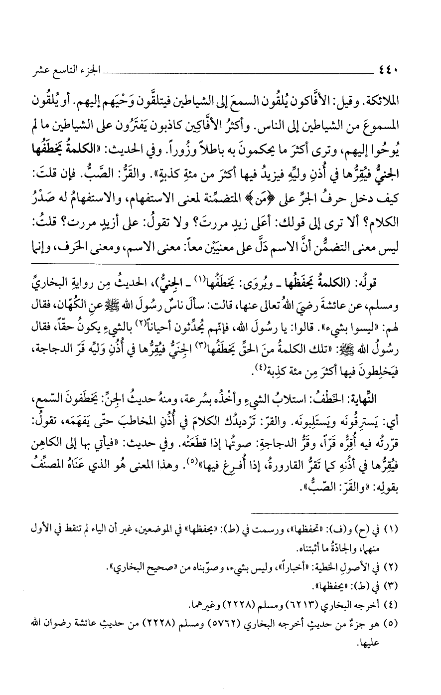 قوله: (الكلمة يحفظها- ويروى: يخطفها- الجني)، الحديث من رواية البخاري ومسلم، عن عائشة رضي الله تعالى عنها، قالت: سأل ناسٌ رسول الله - صلى الله عليه وسلم - عن الكهان، فقال لهم: "ليسوا بشيء". قالوا: يا رسول الله، ف إنهم يحدثون أحياناً بالشيء يكون حقاً، فقال رسول الله - صلى الله عليه وسلم -: "تلك الكلمة من الحق يخطفها الجني فيقرها في أذن وليه قر الدجاجة، فيخلطون فيها أكثر من مئة كذبة.