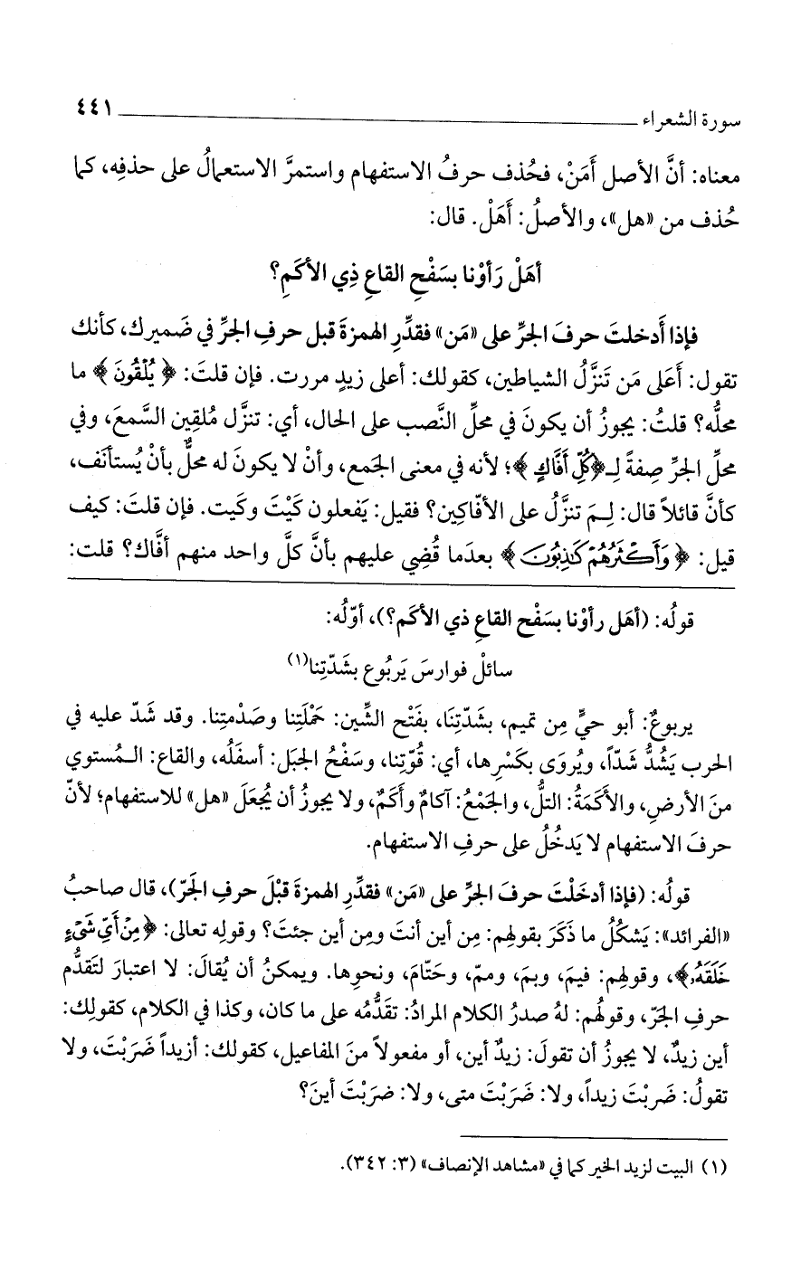 يربوعٌ: أبو حيٍّ من تميم، بشدتنا، بفتح الشين: حملتنا وصدمتنا. وقد شد عليه في الحرب يشد شداً، ويروى بكسرها، أي: قوتنا، وسفح الجبل: أسفله، والقاع: المستوي من الأرض، والأكمة: التل، والجمع: آكامٌ وأكمٌ، ولا يجوز أن يجعل "هل" للاستفهام، لأن حرف الاستفهام لا يدخل على حرف الاستفهام.