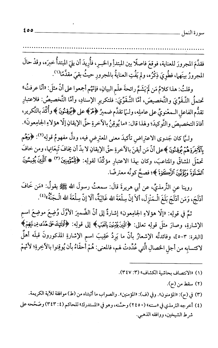 ولما كان جدوى الاعتراض تأكيد معنى المعترض فيه، ودل مفهوم قوله: {وَهُمْ بِالْآَخِرَةِ هُمْ يُوقِنُونَ} على أن من أيقن بالآخرة حق الإيقان لابد أن يخاف تبعاتها، ومن خاف تحمل المشاق والمتاعب، وكان بهذا الاعتبار مؤكدًا لقوله: {لِلْمُؤْمِنِينَ (2) الَّذِينَ يُقِيمُونَ الصَّلَاةَ وَيُؤْتُونَ الزَّكَاةَ}، فصح كونه معترضاً.