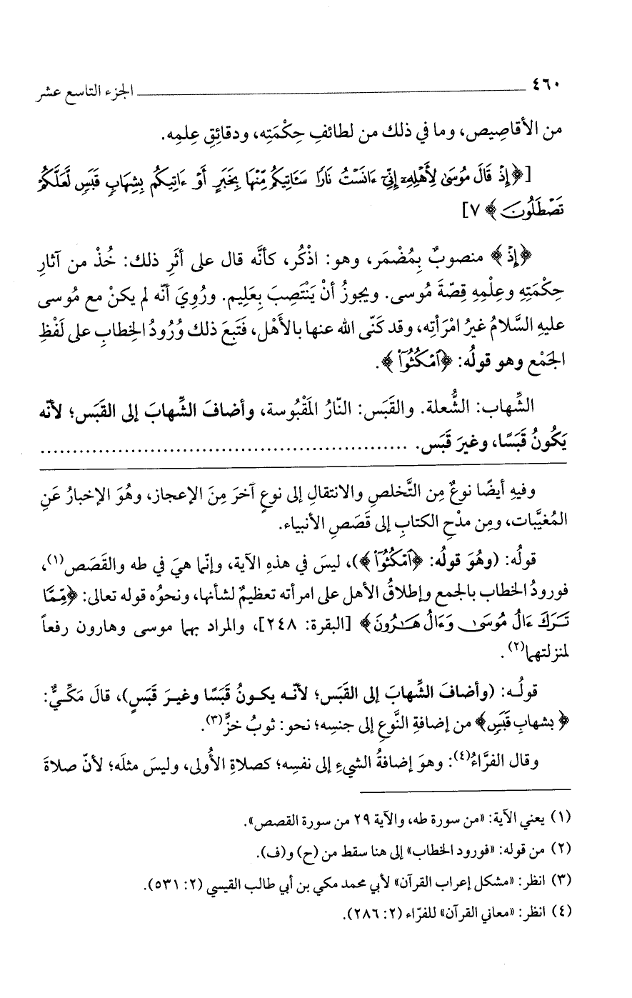 [(إِذْ قالَ مُوسى لِأَهْلِهِ إِنِّي آنَسْتُ ناراً سَآتِيكُمْ مِنْها بِخَبَرٍ أَوْ آتِيكُمْ بِشِهابٍ قَبَسٍ لَعَلَّكُمْ تَصْطَلُونَ)].
