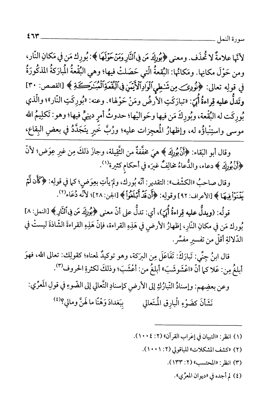 وقال صاحب "الكشف": التقدير: أنه بورك، ولم يأت بعوضٍ، كما في قوله: {كَأَنْ لَمْ يَغْنَوْا فِيهَا} [الأعراف: 92] وقوله: {أَنْ قَدْ أَبْلَغُوا} [الجن: 28]، لأنه دعاء.
