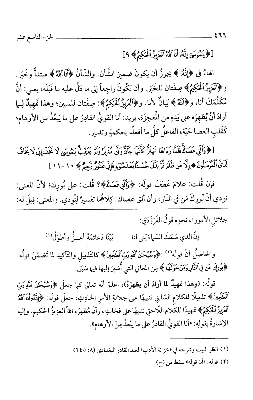 الهاء في (إِنَّهُ) يجوز أن يكون ضمير الشأن. والشأن (أَنَا اللَّهُ) مبتدأ وخبر. و (الْعَزِيزُ الْحَكِيمُ) صفتان للخبر. وأن يكون راجعا إلى ما دل عليه ما قبله، يعني: أنّ مكلمك أنا، و (اللهُ) بيان لأنا. و (الْعَزِيزُ الْحَكِيمُ): صفتان للمبين، وهذا تمهيد لما أراد أن يظهره على يده من المعجزة، يريد: أنا القوي القادر على ما يبعد من الأوهام؛ كقلب العصا حية، الفاعل كل ما أفعله بحكمة وتدبير.