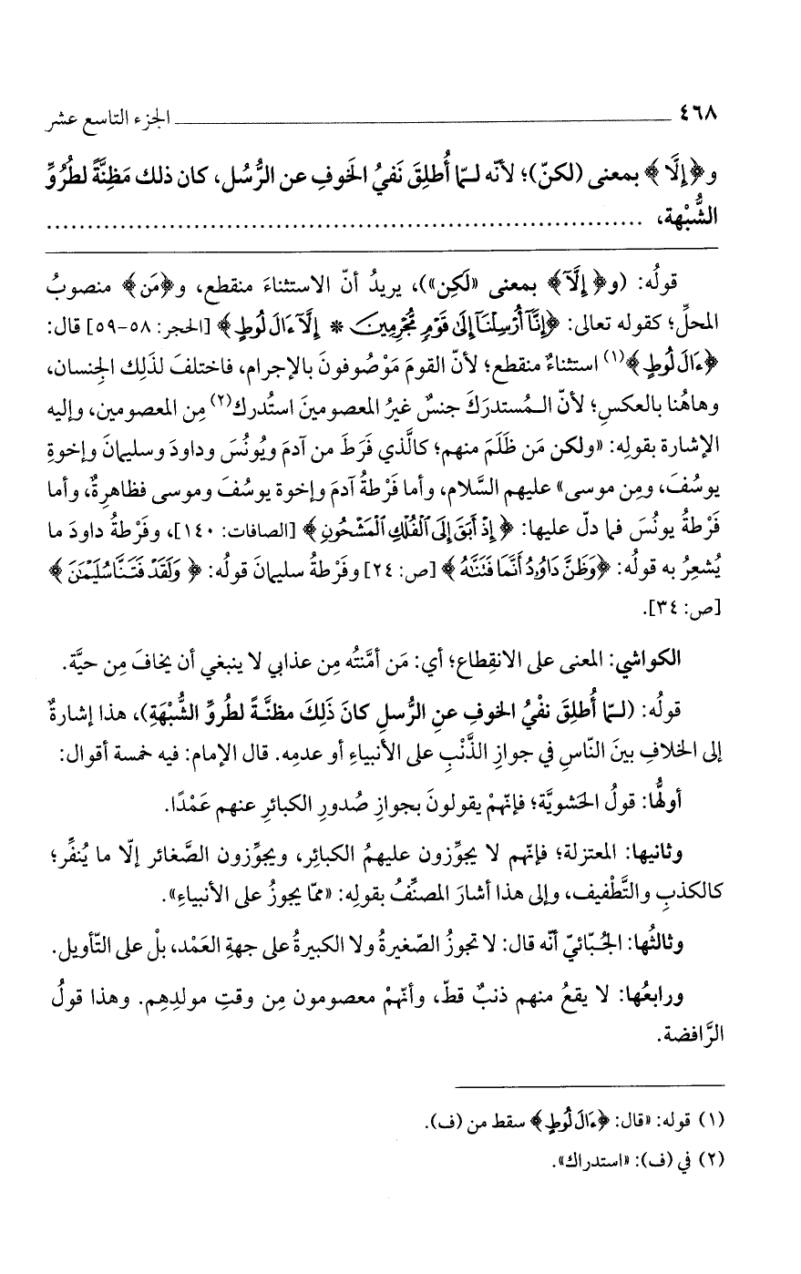 قوله: (لما أطلق نفي الخوف عن الرسل كان ذلك مظنةً لطرو الشبهة)، هذا إشارةٌ إلى الخلاف بين الناس في جواز الذنب على الأنبياء أو عدمه. قال الإمام: فيه خمسة أقوال: