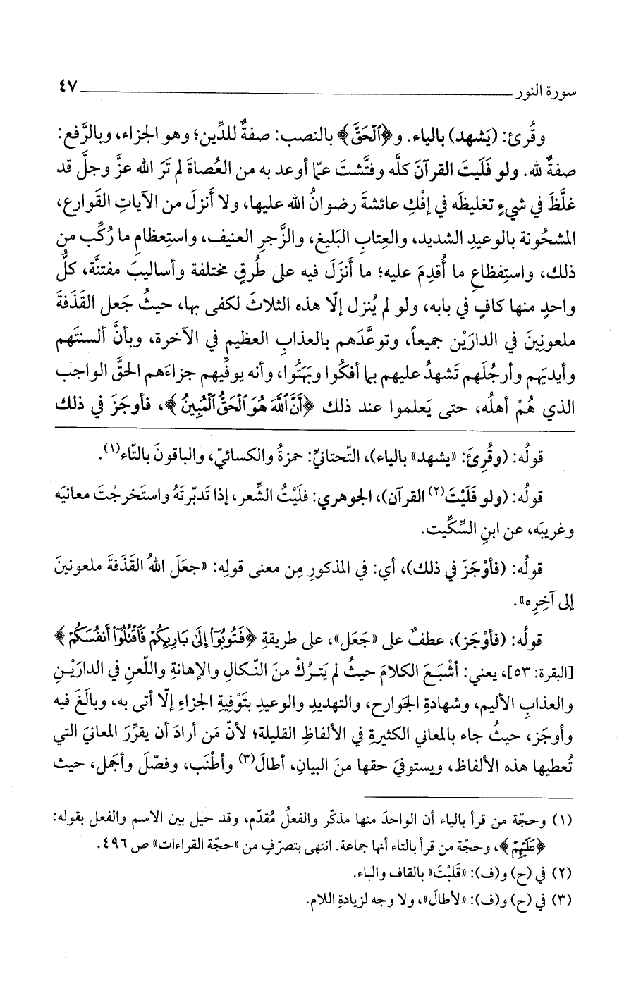 وقرئ: (يشهد) بالياء. و {الْحَقَّ} بالنصب: صفةٌ للدين، وهو الجزاء، وبالرفع، صفةٌ لله. ولو فليت القرآن كله وفتشت عما أوعد به من العصاة لم تر الله عز وجل قد غلظ في شيءٍ في إفك عائشة رضوان الله عليها، ولا أنزل من الآيات القوارع، المشحونة بالوعيد الشديد، والعتاب البليغ، والزجر العنيف، واستعظام ما ركب من ذلك، واستفظاع ما أقدم عليه، ما أنزل فيه على طرقٍ مختلفة وأساليب مفتنة، كل واحدٍ منها كافٍ في بابه، ولو لم ينزل إلا هذه الثلاث لكفى بها، حيث جعل القذفة ملعونين في الدارين جميعاً، وتوعدهم بالعذاب العظيم في الآخرة، وبأن ألسنتهم وأيديهم وأرجلهم تشهد عليهم بما أفكوا وبهتوا، وأنه يوفيهم جزاءهم الحق الواجب الذي هم أهله، حتى يعلموا عند ذلك {أَنَّ اللَّهَ هُوَ الْحَقُّ الْمُبِينُ}، فأوجز في ذلك