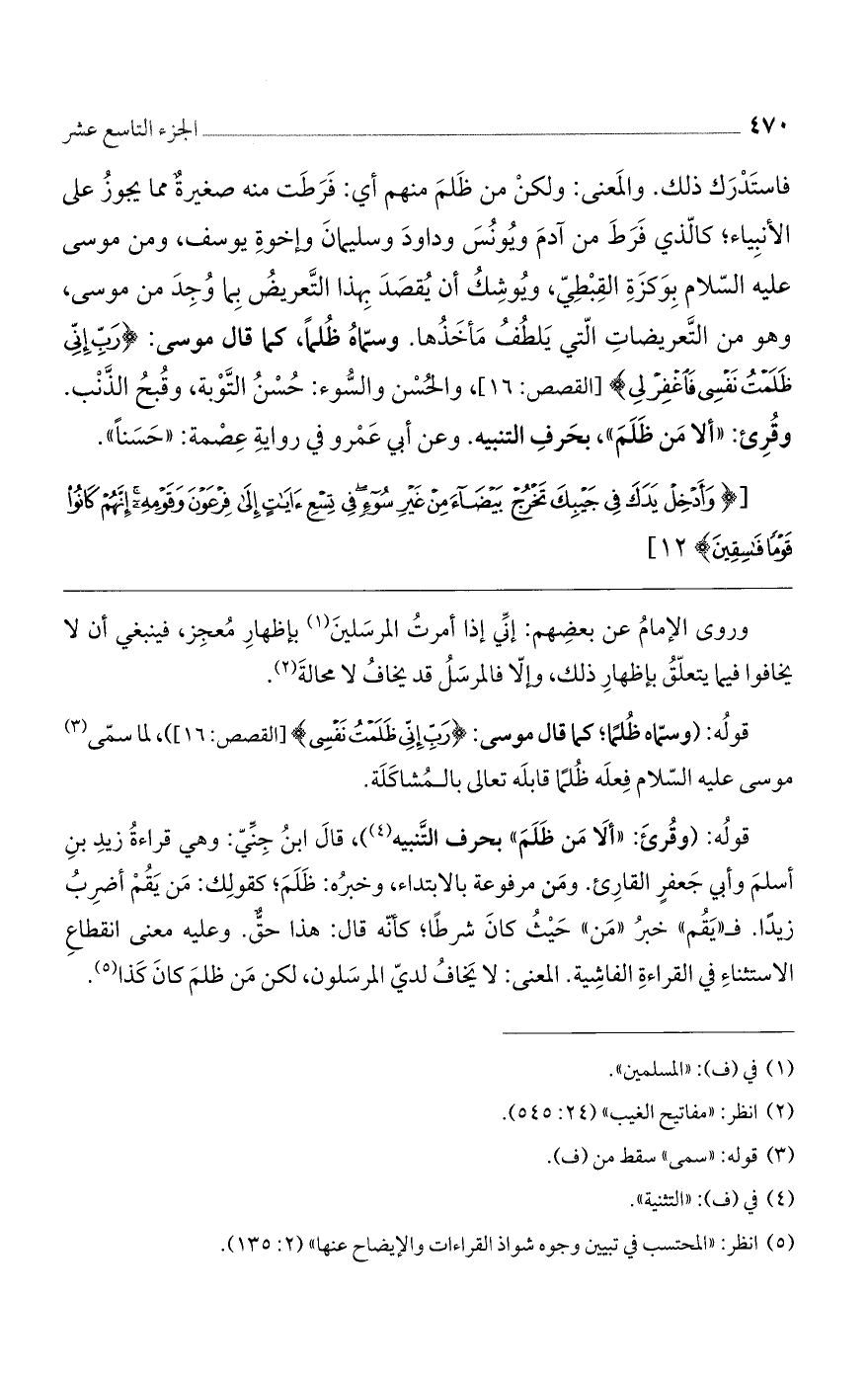 قوله: (وقرئ: "ألا من ظلم" بحرف التنبيه)، قال ابن جني: وهي قراءة زيد بن أسلم وأبي جعفرٍ القارئ. ومن مرفوعة بالابتداء، وخبره: ظلم، كقولك: من يقم أضرب زيدًا. فـ "يقم" خبر "من" حيث كان شرطاً، كأنه قال: هذا حقٌ. وعليه معنى انقطاع الاستثناء في القراءة الفاشية. المعنى: لا يخاف لدى المرسلون، لكن من ظلم كان كذا.