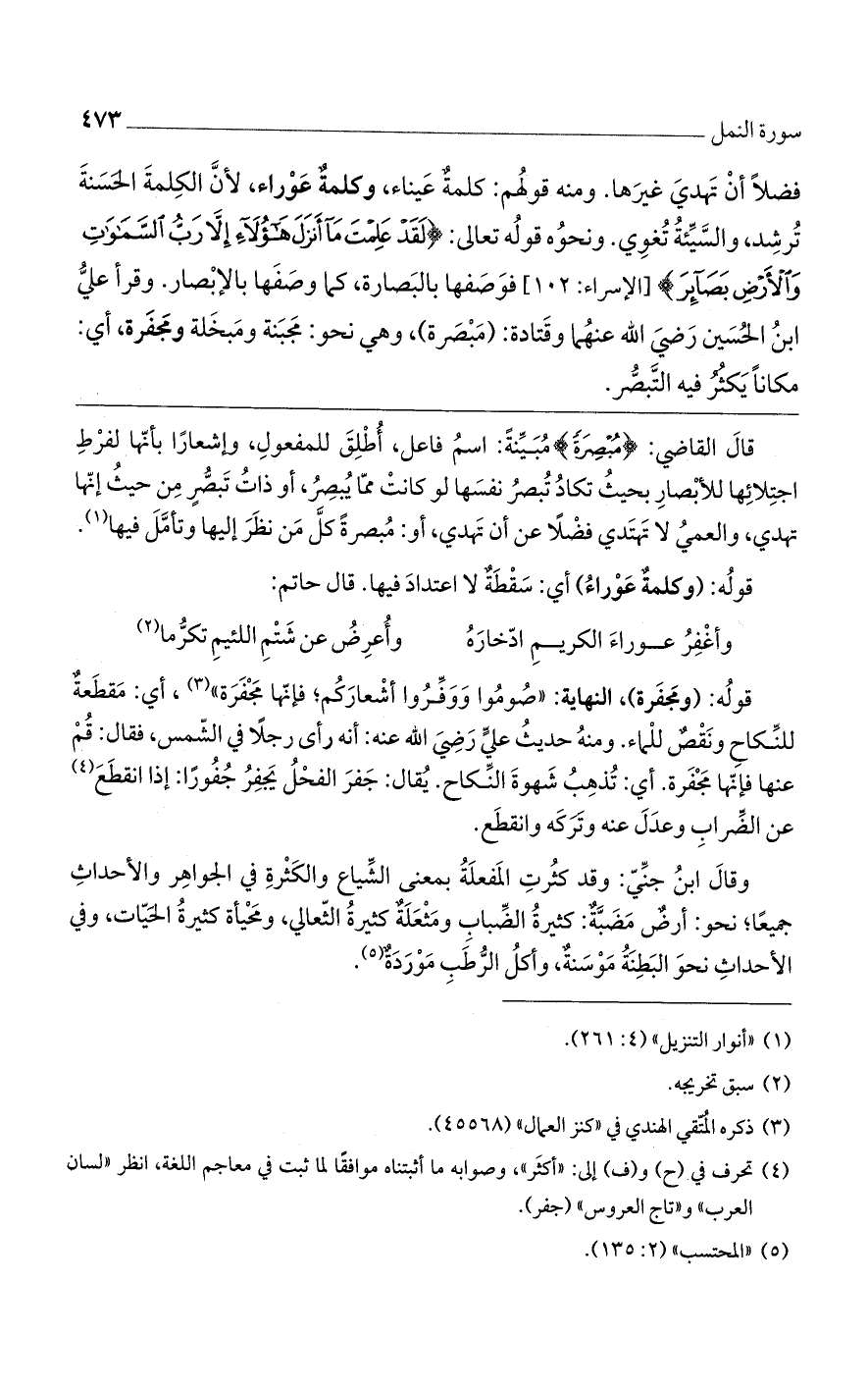 فضلا أن تهدي غيرها. ومنه قولهم: كلمة عيناء، وكلمة عوراء، لأن الكلمة الحسنة ترشد، والسيئة تغوي. ونحوه قوله تعالى: (لَقَدْ عَلِمْتَ ما أَنْزَلَ هؤُلاءِ إِلَّا رَبُّ السَّماواتِ وَالْأَرْضِ بَصائِرَ) [الإسراء: 102] فوصفها بالبصارة، كما وصفها بالإبصار. وقرأ علىّ بن الحسين رضي الله عنهما وقتادة: (مبصرة)، وهي نحو: مجبنة ومبخلة ومجفرة، أي: مكانا يكثر فيه التبصر.