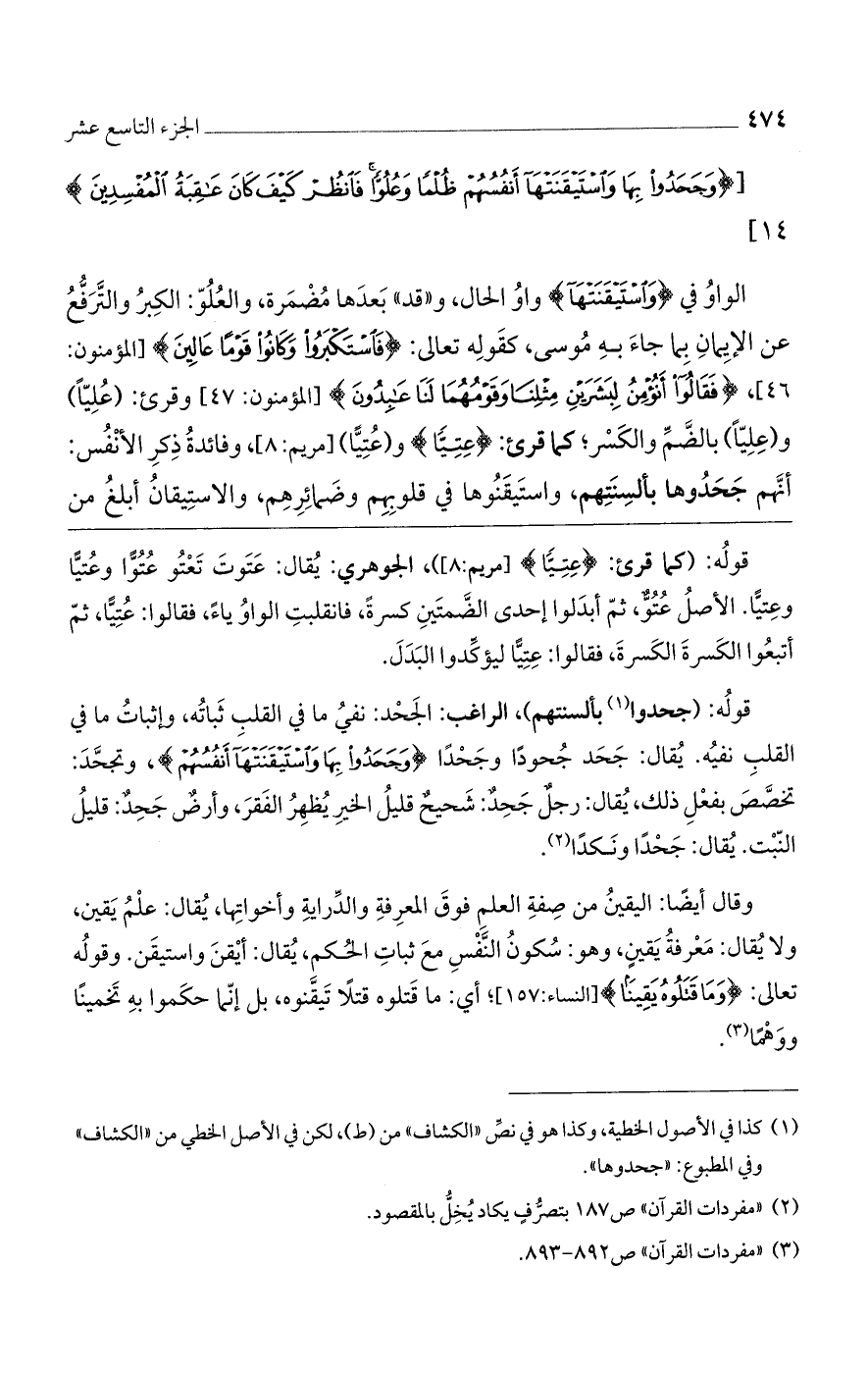 الواو في (وَاسْتَيْقَنَتْها) واو الحال، و "قد" بعدها مضمرة، والعلو: الكبر والترفع عن الإيمان بما جاء به موسى، كقوله تعالى: (فَاسْتَكْبَرُوا وَكانُوا قَوْماً عالِينَ) [المؤمنون: 46]، (فَقالُوا أَنُؤْمِنُ لِبَشَرَيْنِ مِثْلِنا وَقَوْمُهُما لَنا عابِدُونَ) [المؤمنون: 47] وقرئ: (عُلِيّا و (عِلِيّا) بالضم والكسر، كما قرئ (عِتِيًّا) و (عُتِيًّا) [مريم: 8]. وفائدة ذكر الأنفس: أنهم جحدوها بألسنتهم، واستيقنوها في قلوبهم وضمائرهم. والاستيقان أبلغ من
