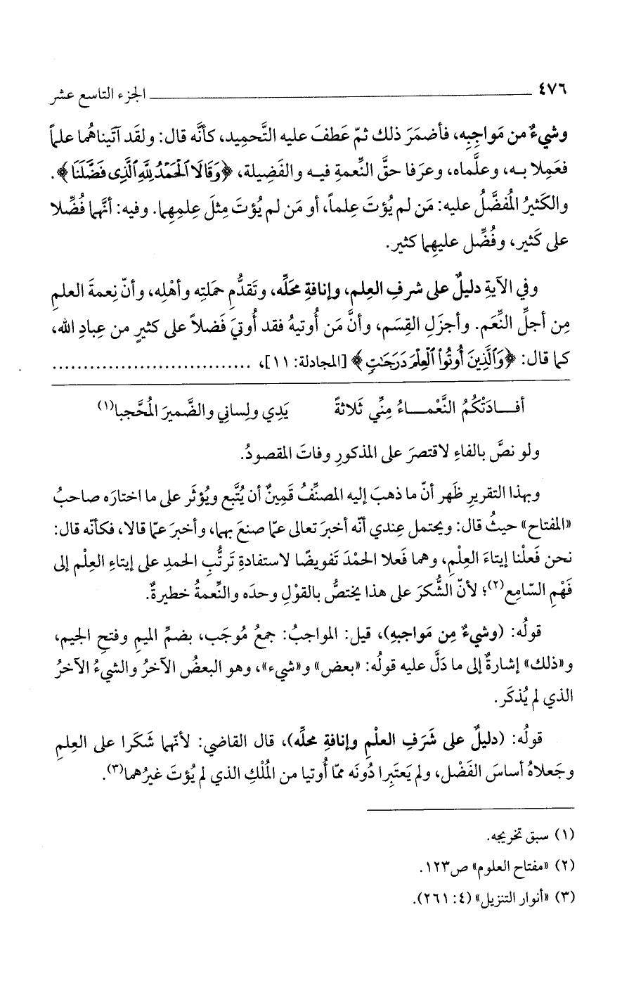 وبهذا التقرير ظهر أن ما ذهب إليه المصنف قمينٌ أن يتبع ويؤثر على ما اختاره صاحب "المفتاح" حيث قال: ويحتمل عندي أنه أخبر تعالى عما صنع بهما، وأخبر عما قالا، فكأنه قال: نحن فعلنا إيتاء العلم، وهما فعلا الحمد تفويضاً لاستفادة ترتب الحمد على إيتاء العلم إلى فهم السامع، لأن الشكر على هذا يختص بالقول وحده والنعمة خطيرةٌ.