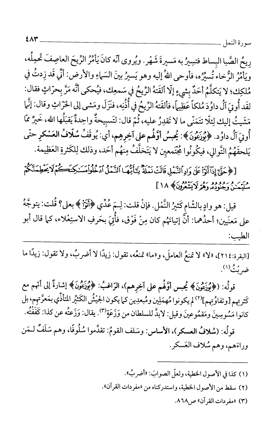 ريح الصبا البساط فتسير به مسيرة شهر. ويروى أنه كان يأمر الريح العاصف تحمله، ويأمر الرخاء تسيره، فأوحى الله إليه وهو يسير بين السماء والأرض: أني قد زدت في ملكك؛ لا يتكلم أحد بشيء إلا ألقته الريح في سمعك، فيحكى أنه مر بحرّاث فقال: لقد أوتى آل داود ملكا عظيما، فألقته الريح في أذنه، فنزل ومشى إلى الحرّاث وقال: إنما مشيت إليك لئلا تتمنى ما لا تقدر عليه، ثم قال: لتسبيحة واحدة يقبلها الله، خير مما أوتى آل داود. (يُوزَعُونَ): يحبس أولهم على آخرهم، أي: توقف سلاف العسكر حتى تلحقهم التوالي فيكونوا مجتمعين لا يتخلف منهم أحد، وذلك للكثرة العظيمة.