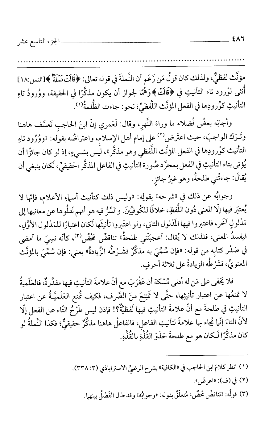وأجابه بعض فضلاء ما وراء النهر، وقال: لعمري إن ابن الحاجب تعسف هاهنا وترك الواجب، حيث اعترض على إمام أهل الإسلام، واعتراضه بقوله: "وورود تاء التأنيث كورودها في الفعل المؤنث اللفظي وهو مذكر"، ليس بشيءٍ، إذ لو كان جائزًا أن يؤتى بتاء التأنيث في الفعل بمجرد صورة التأنيث في الفاعل المذكر الحقيقي، لكان ينبغي أن يقال: جاءتني طلحة، وهو غير جائزٍ.