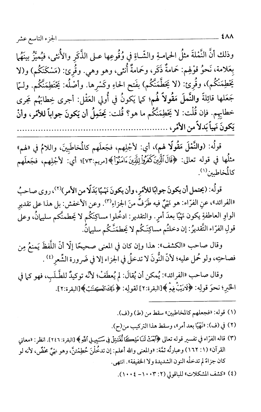 قوله: (يحتمل أن يكون جوابًا للأمر، وأن يكون نهيًا بدلًا من الأمر)، روى صاحب "الفرائد"، عن الفراء: هو نهيٌ فيه طرفٌ من الجزاء. وعن الأخفش: بل هذا على تقدير الواو العاطفة يكون نهياً بعد أمرٍ. والتقدير: ادخلوا مساكنكم لا يحطنكم سليمان، وعلى قول الفراء التقدير: إن دخلتم مساكنكم لا يحطمنكم سليمان.