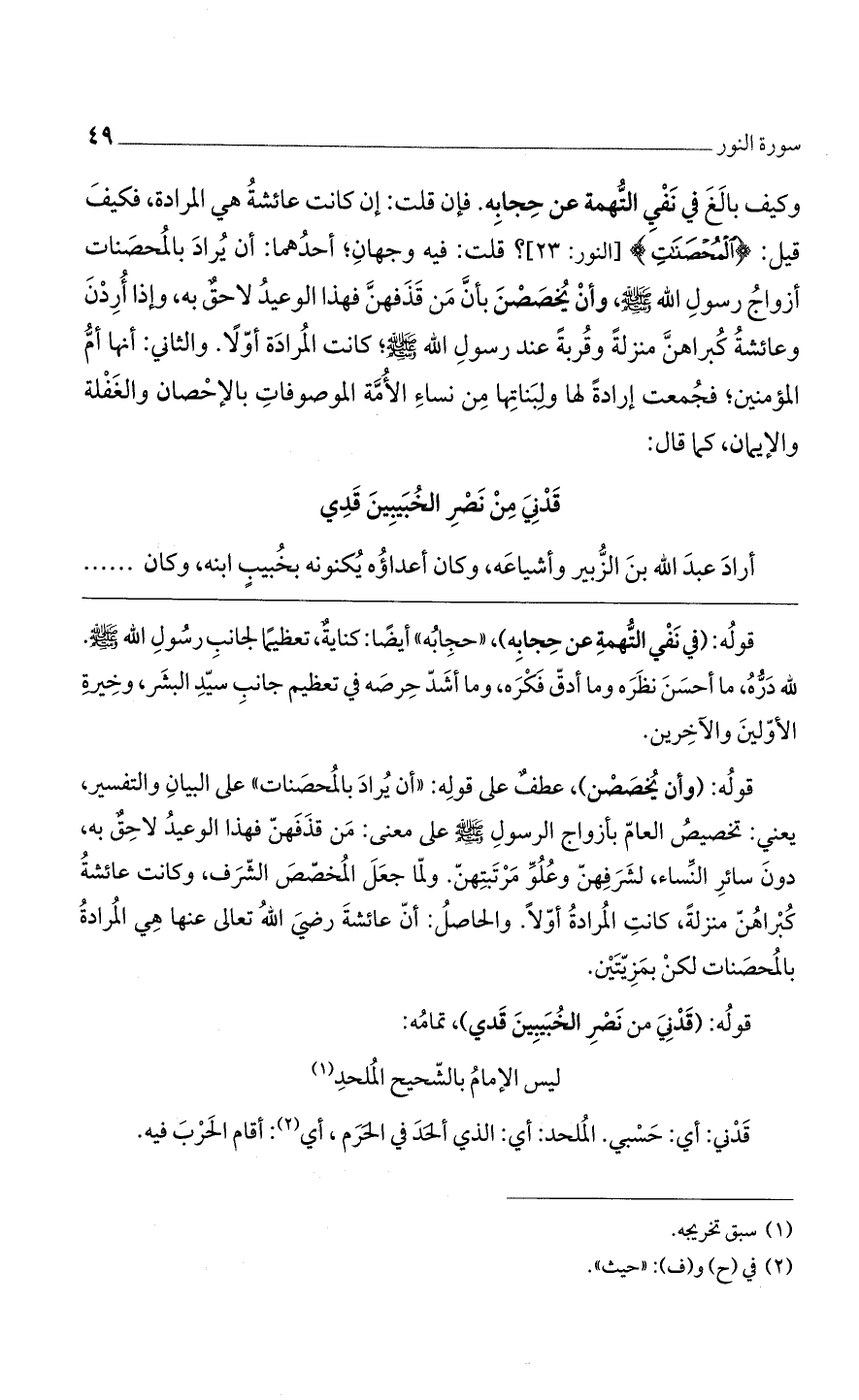 وكيف بالغ في نفي التهمة عن حجابه. فإن قلت: إن كانت عائشة هي المرادة، فكيف قيل: {الْمُحْصَنَاتُ} [النور: 23]؟ قلت: فيه وجهان، أحدهما: أن يراد بالمحصنات أزواج رسول الله - صلى الله عليه وسلم - وأن يخصص بأن من قذفهن فهذا الوعيد لا حقٌ به، وإذا أردن وعائشة كبراهن منزلةً وقربةً عند رسول الله - صلى الله عليه وسلم -، كانت المرادة أولًا. والثاني: أنها أم المؤمنين، فجمعت إرادةً لها ولبناتها من نساء الأمة الموصوفات بالإحصان والغفلة والإيمان، كما قال: