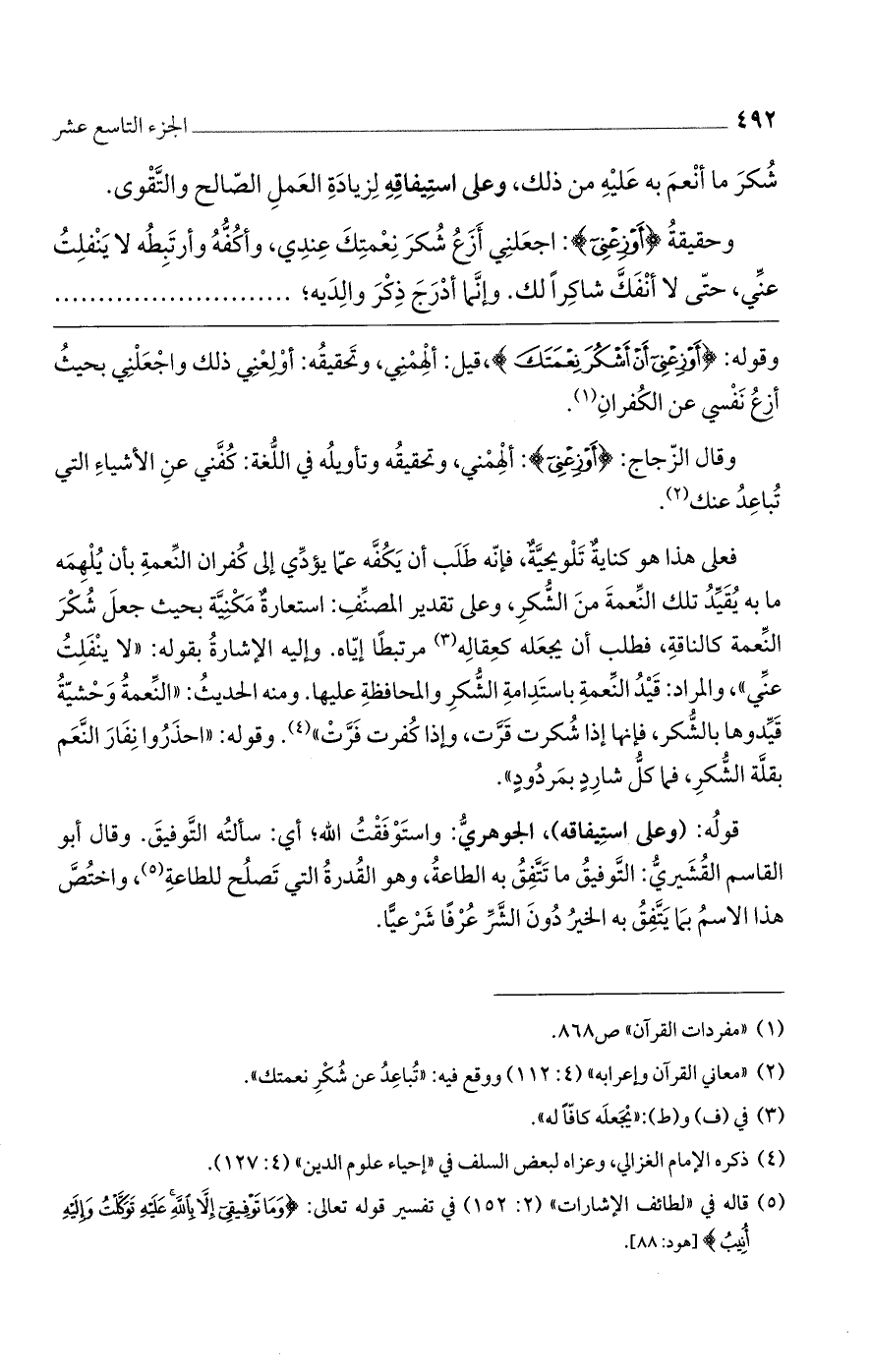 وقوله: {أَوْزِعْنِي أَنْ أَشْكُرَ نِعْمَتَكَ}، قيل: ألهمني، وتحقيقه: أولعني ذلك واجعلني بحيث أزع نفسي عن الكفران.