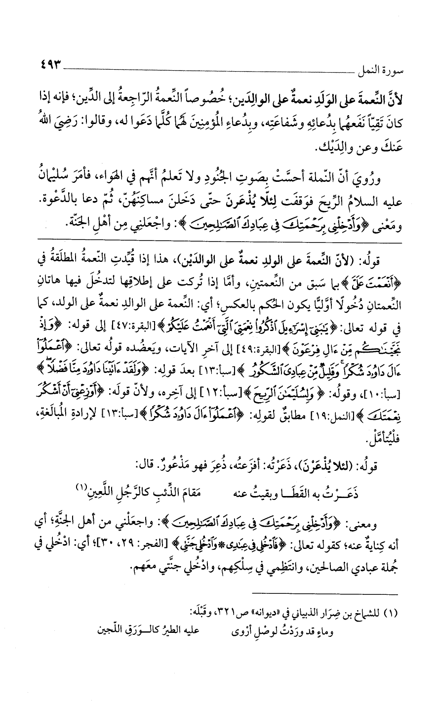 قوله: (لأن النعمة على الولد نعمةٌ على الولدين)، هذا إذا قيدت النعمة المطلقة في {أَنْعَمْتَ عَلَيَّ} بما سبق من النعمتين، وأما إذا تركت على إطلاقها لتدخل فيها هاتان النعمتان دخولًا أوليًا يكون الحكم بالعكس، أي: النعمة على الوالد نعمةٌ على الولد، كما في قوله تعالى: {يَا بَنِي إِسْرَائِيلَ اذْكُرُوا نِعْمَتِيَ الَّتِي أَنْعَمْتُ عَلَيْكُمْ} [البقرة: 47] إلى قوله: {وَإِذْ نَجَّيْنَاكُمْ مِنْ آَلِ فِرْعَوْنَ} [البقرة: 49] إلى آخر الآيات، ويعضده قوله تعالى: {اعْمَلُوا آَلَ دَاوُودَ شُكْرًا وَقَلِيلٌ مِنْ عِبَادِيَ الشَّكُورُ} [سبا: 13] بعد قوله: {وَلَقَدْ آَتَيْنَا دَاوُودَ مِنَّا فَضْلًا} [سبأ: 10]، وقوله: {وَلِسُلَيْمَانَ الرِّيحَ} [سبأ: 12] إلى آخره، ولأن قوله: {أَوْزِعْنِي أَنْ أَشْكُرَ نِعْمَتَكَ} [النمل: 19] مطابقٌ لقوله: {اعْمَلُوا آَلَ دَاوُودَ شُكْرًا} [سبأ: 13] لإرادة المبالغة، فليتأمل.