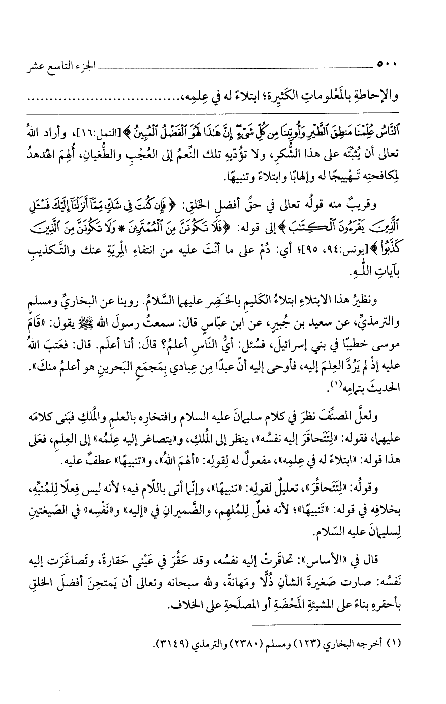 ولعل المصنف نظر في كلام سليمان عليه السلام وافتخاره بالعلم والملك فبنى كلامه عليهما، فقوله: "لتتحاقر إليه نفسه"، ينظر إلى الملك، و"يتصاغر إليه علمه" إلى العلم، فعلى هذا قوله: "ابتلاءً له في علمه"، مفعولٌ له لقوله: "ألهم الله"، و"تنبيهاً" عطفٌ عليه.