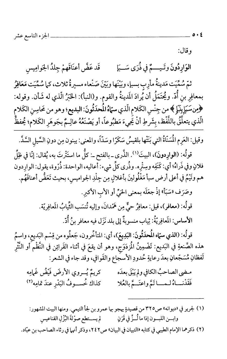 قوله: (الواردون)، البيت. الذرى- بالفتح-: كل ما استترت به، يقال: إنا في ظل فلانٍ وفي ذراه، أي: كنفه وستره. وذرى كل شيء: أعاليه، الواحدة: ذروة، يقول: الواردون هم وتيم في أعلى أرض سبأ مغلولين بأغلالٍ من جلد الجواميس، بحيث تعض أعناقهم.