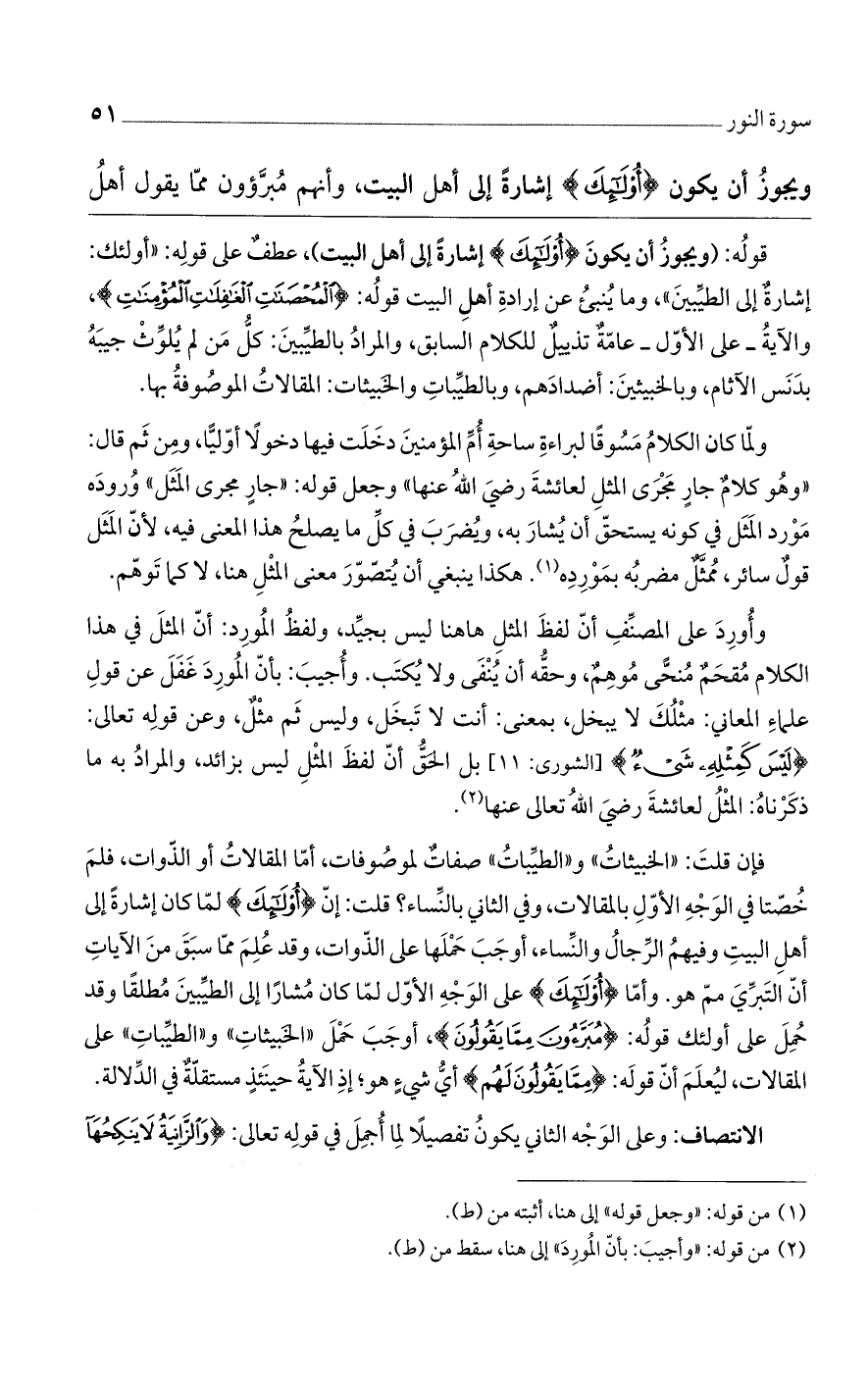قوله: (ويجوز أن يكون {أُولَئِكَ} إشارةً إلى أهل البيت)، عطفٌ على قوله: "أولئك: إشارةٌ إلى الطيبين"، وما ينبئ عن إرادة أهل البيت قوله: {الْمُحْصَنَاتِ الْغَافِلَاتِ الْمُؤْمِنَاتِ}، والآية- على الأول- عامةٌ تذييل للكلام السابق، والمراد بالطيبين: كل من لم يلوث جيبه بدنس الآثام، وبالخبيثين: xxxx، وبالطيبات والخبيثات: المقالات الموصوفة بها.